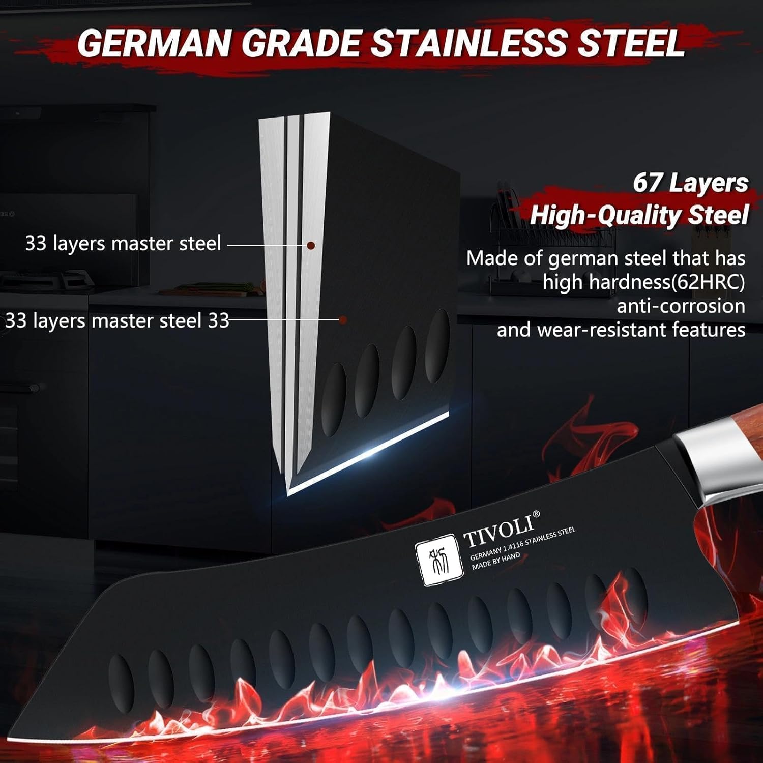 • STAIN-RESISTANT AND EASY TO CLEAN — TIVOLI deep cooking knife set deliver superior resistance to rust, corrosion, and stains. This advanced material ensures an optimal balance of exceptional edge retention and structural durability. To preserve good knife for cooking precision and longevity, we recommend hand washing with a mild detergent immediately after use and gently drying with a soft cloth