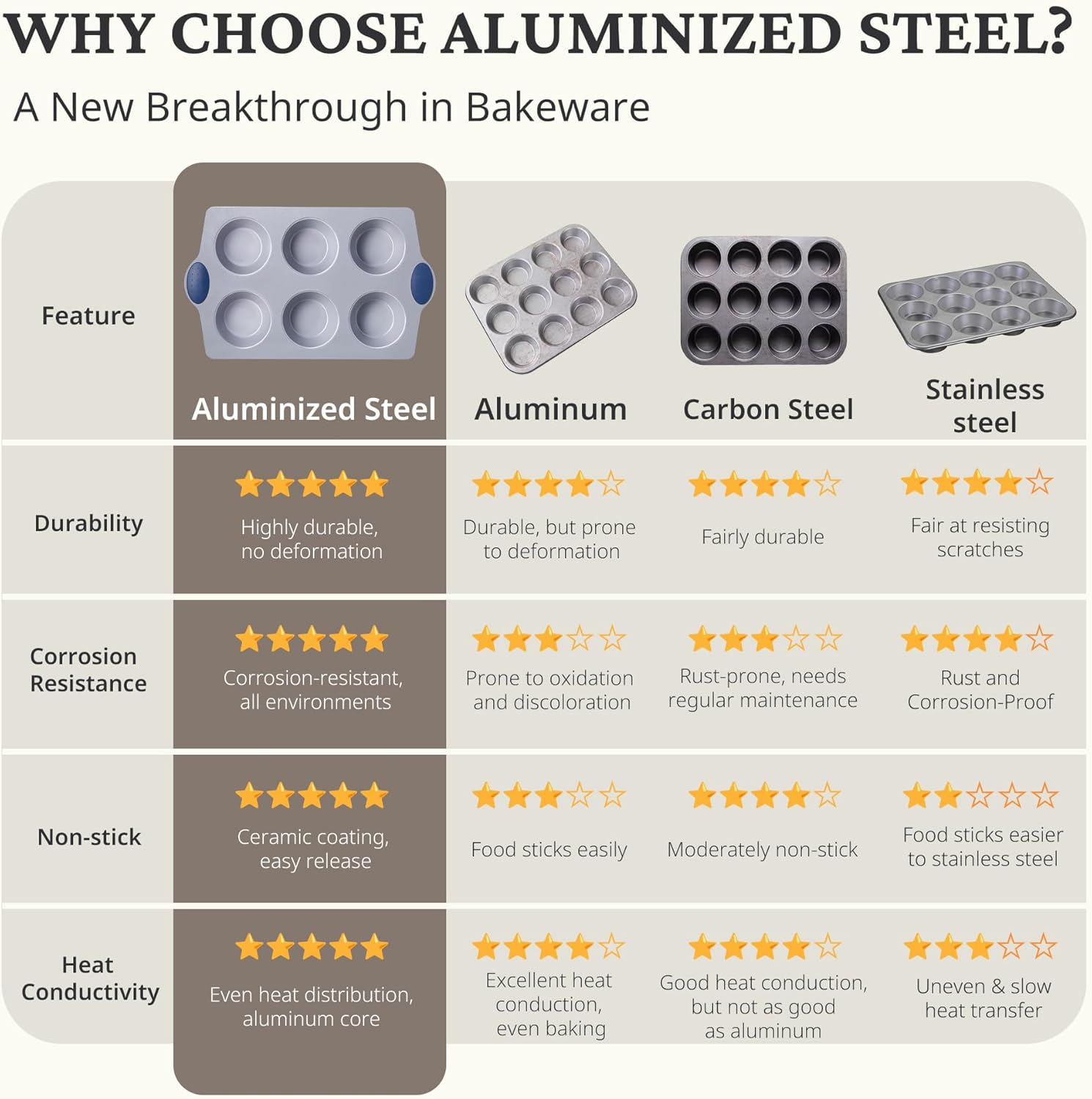 • Heavy-Duty Aluminized Steel: large muffin pan and large cupcake pans are made from highly durable aluminized steel, offering 50% better corrosion resistance and durability compared to traditional jumbo muffin pans. The even heat distribution significantly shortens baking time and can withstand temperatures up to 500°F. Suitable for use in microwaves, ovens, dishwashers, refrigerators, and freezers, greatly enhancing convenience.
