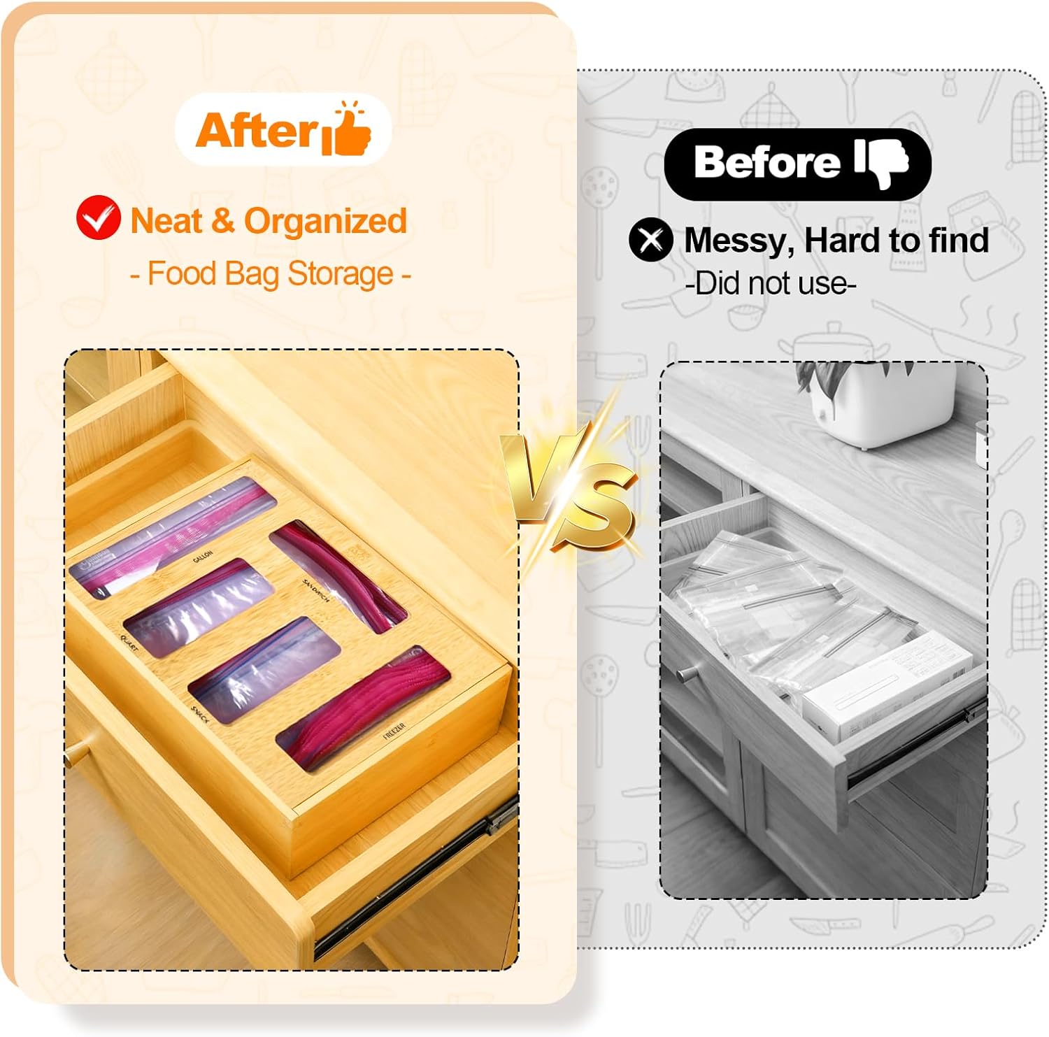 • Food Storage Bag Organizer:Keep your drawer tidy with this bamboo bag storage compatible with ziploc. Measuring 13.7"L*11.8H"*3.1W", it helps bring order to your storage space