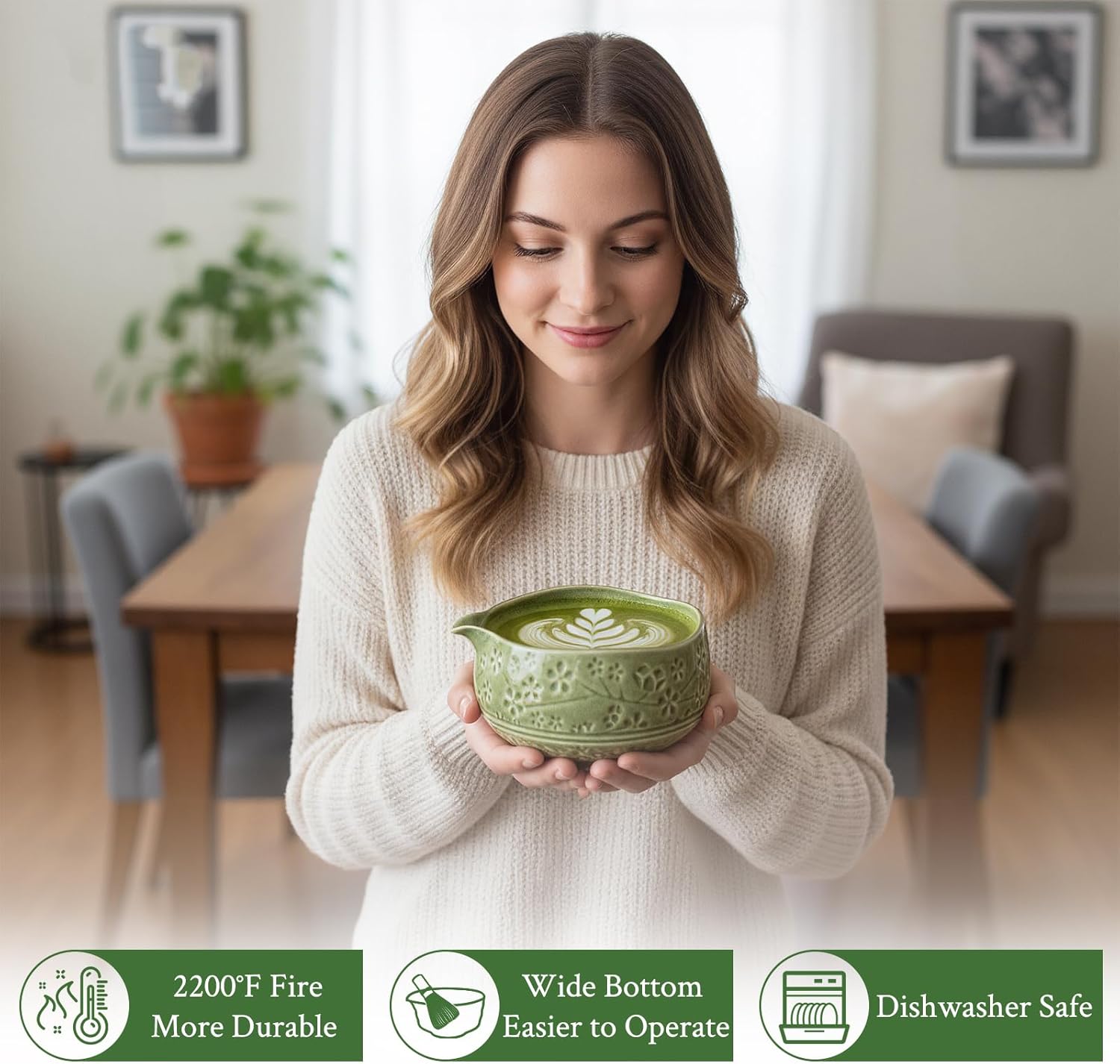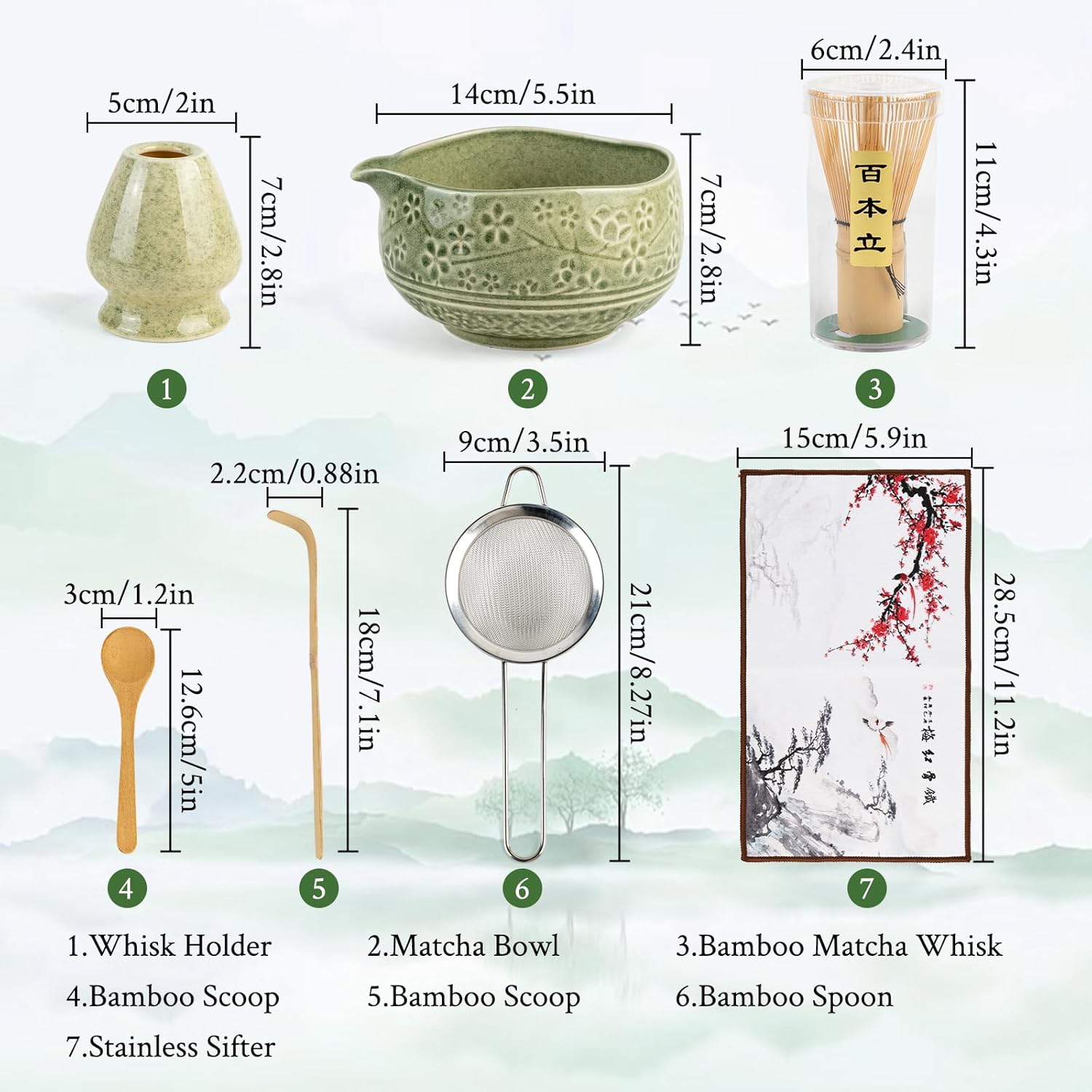 Matcha Whisk Set - Ceramic Matcha Set Includes Matcha Bowl, Whisk and Holder, Bamboo Scoop, Scoop Rest, Sifter and Tea Towel - 7 Pcs Ceremonial Gift Kit for Matcha Lovers (Floral Green)