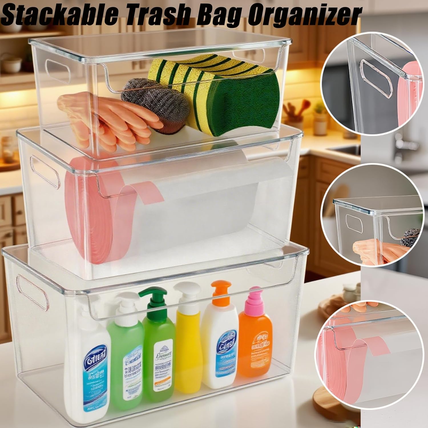 • 【Stackable Design】Built to maximize vertical storage, these garbage bag organizers can be stacked neatly under the sink or in cabinets. Each comes with a lid that keeps rolls dust-free while also adding usable space on top—perfect for storing additional cleaning supplies.