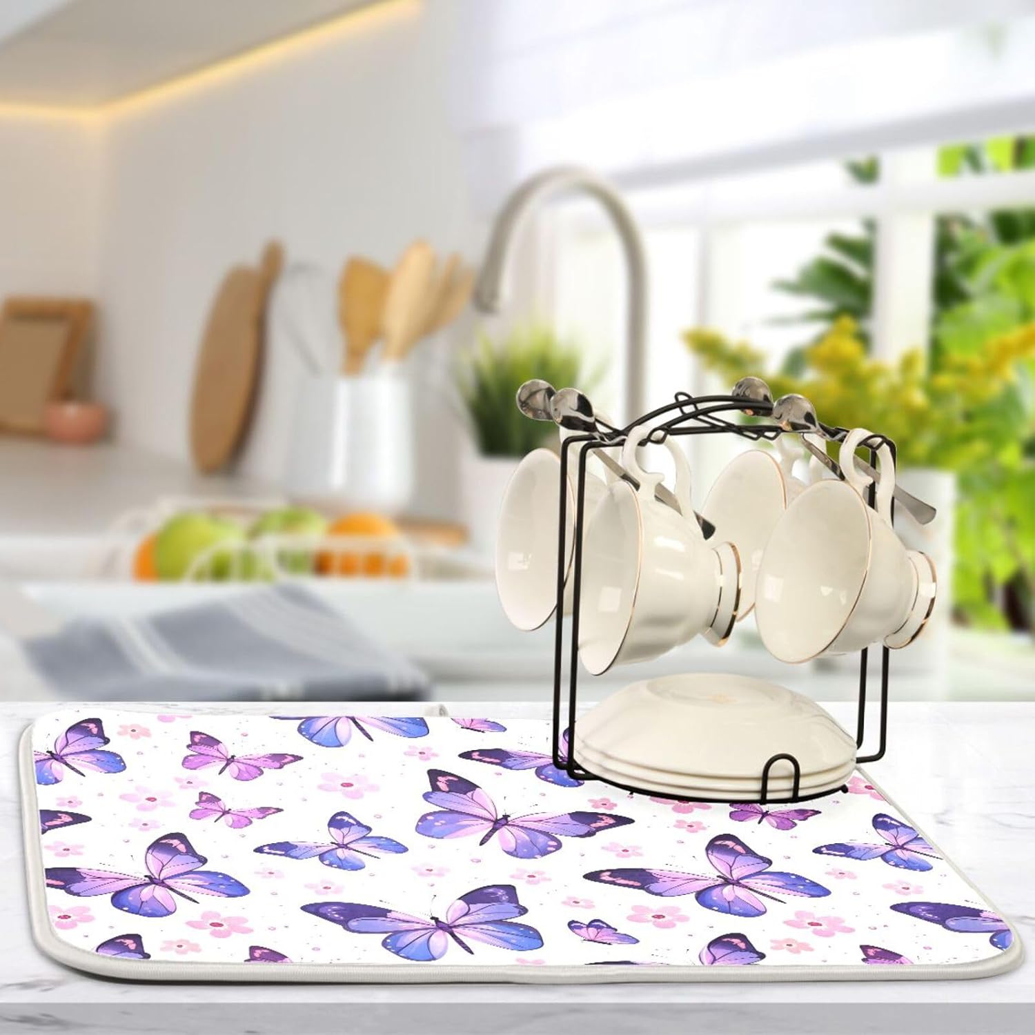 Pink Purple Butterfly Flower Dish Drying Mat for Kitchen Counter Absorbent Dish Drainer Mats Drying Pads 18"x24"