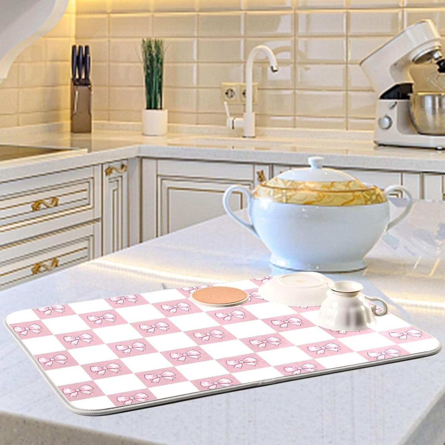 Pink White Bow Checkered Dish Drying Mat for Kitchen Counter Absorbent Dish Drainer Mats Drying Pads 18"x24"