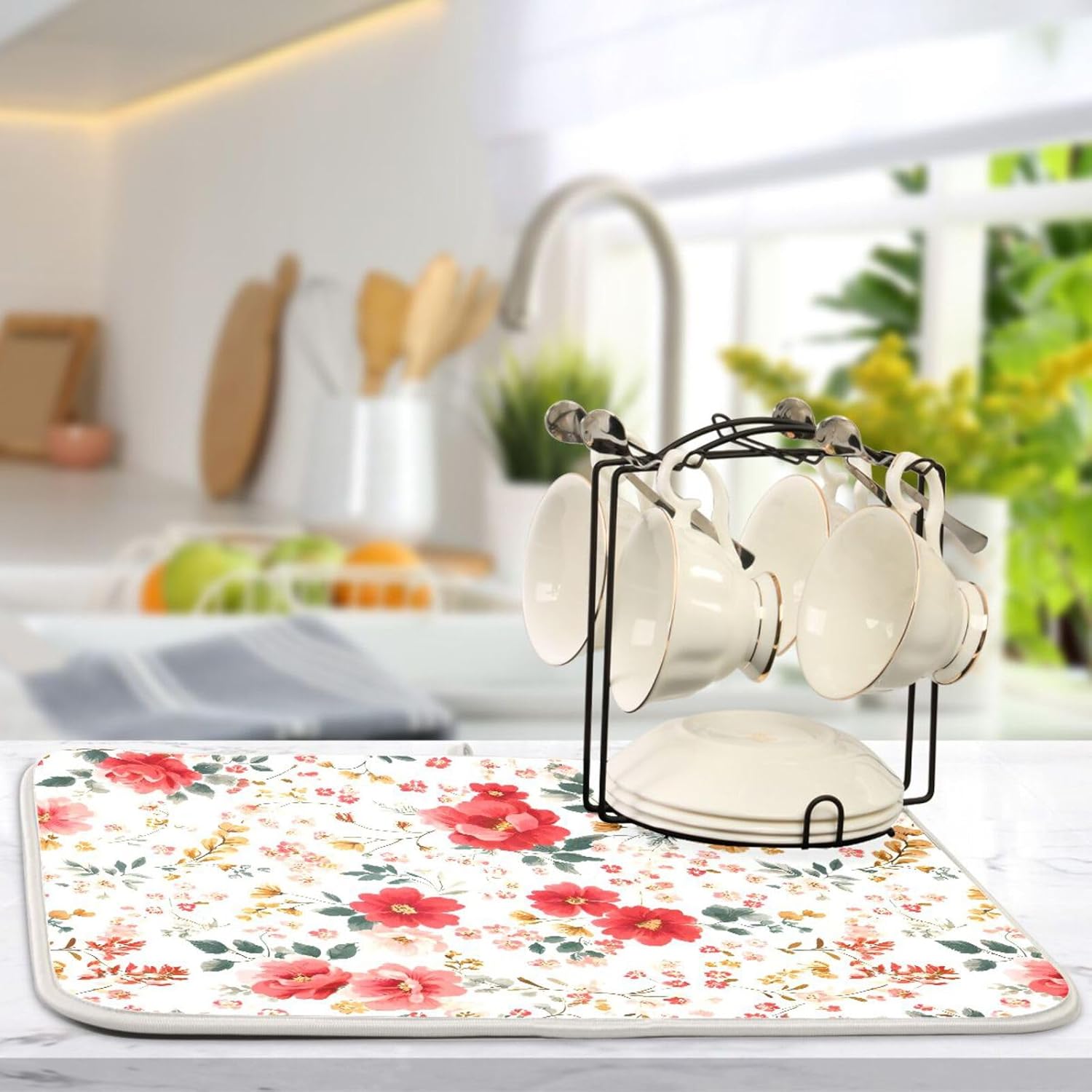 Spring Floral Colorful Flowers Dish Drying Mat for Kitchen Counter Absorbent Dish Drainer Mats Drying Pads 18"x24"
