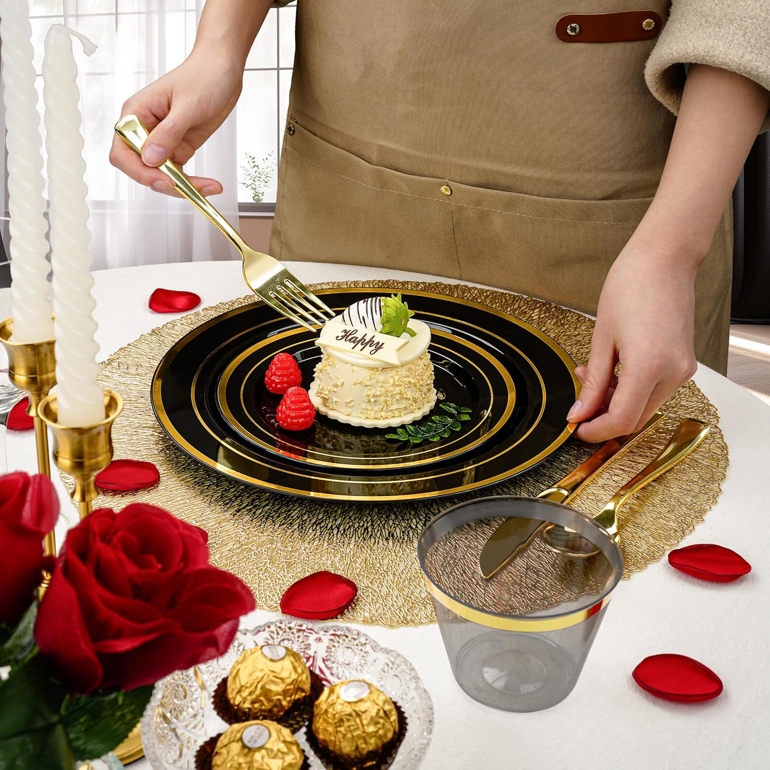 • WHAT YOU GET - Our 350-piece disposable dinnerware set is tailor-made for your 50 guests. You will receive a comprehensive package featuring 50 black gold plastic plates 10, 50 salad plates 7, 50 cups 9 OZ, 50 knives, 50 forks and 50 spoons.