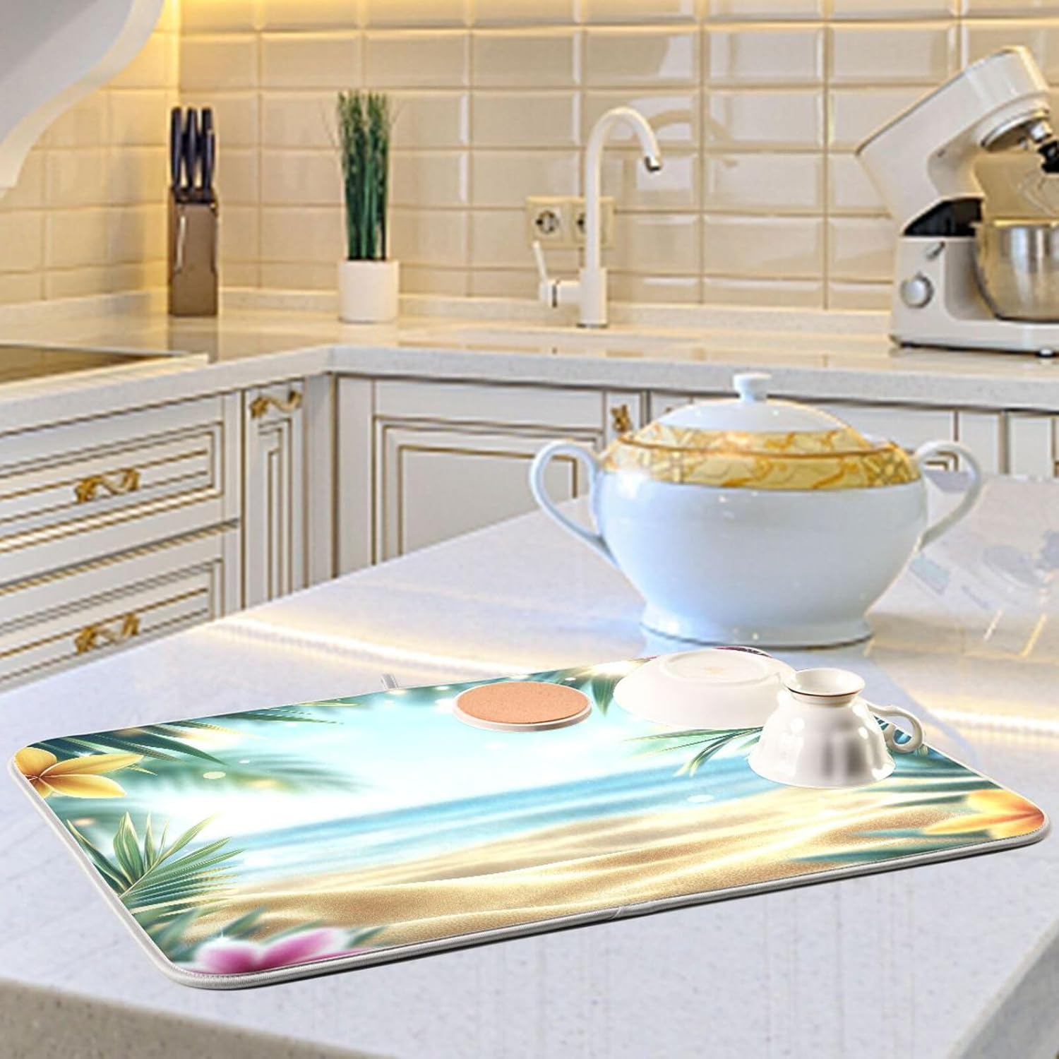 Summer Tropical Flowers Palm Leaves Dish Drying Mat for Kitchen Counter Super Absorbent Dishes Pad Reversible Microfiber Protector Dish Draining Mats 18x24 inch