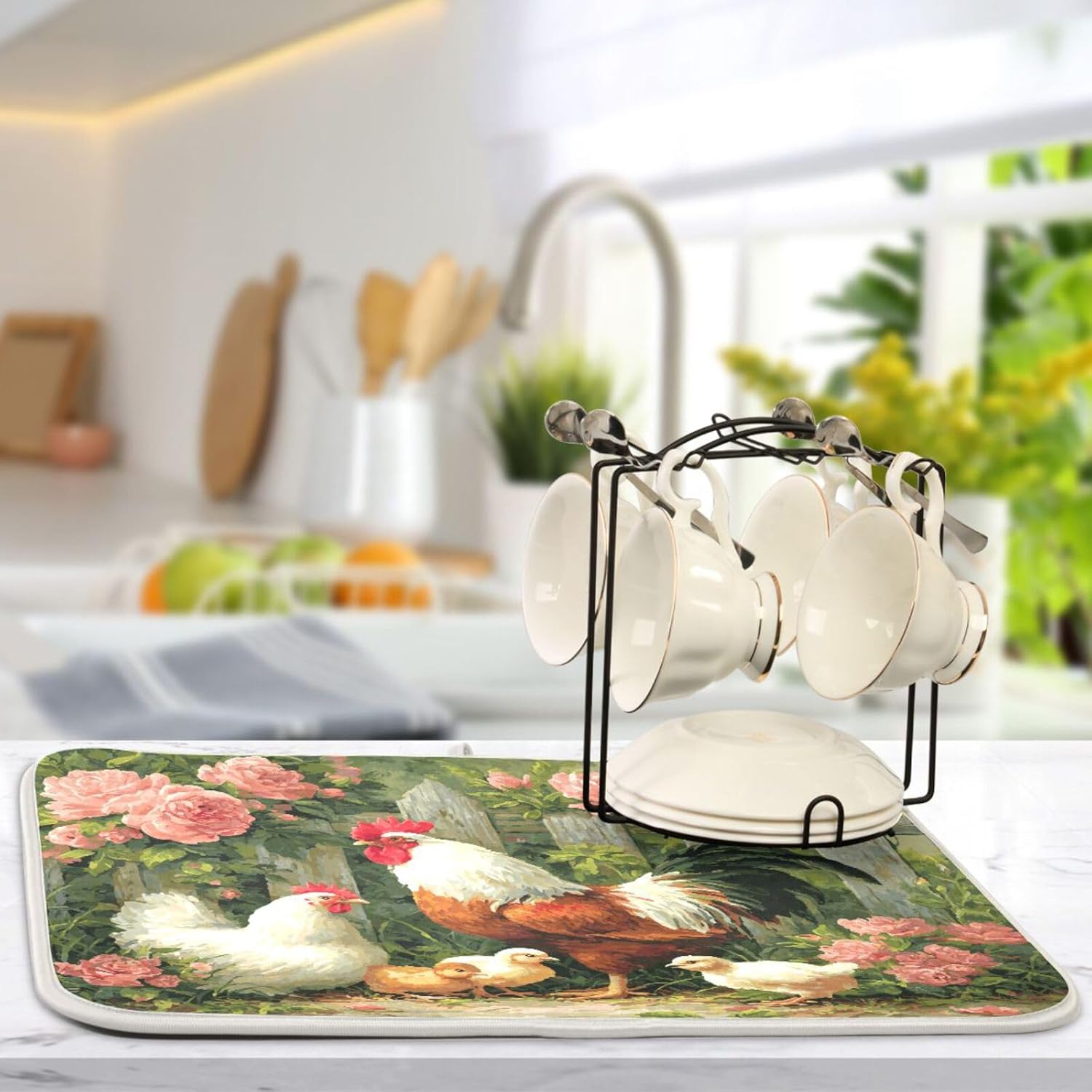 Farm Chickens Rooster Dish Drying Mat for Kitchen Counter Super Absorbent Dishes Pad Reversible Microfiber Protector Dish Draining Mats 18x24 inch