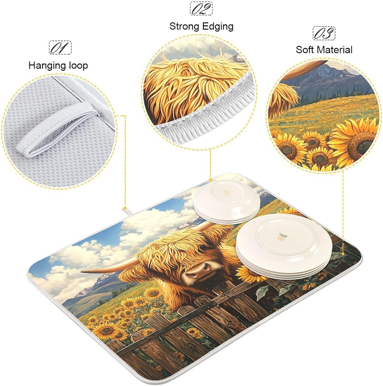 Highland Cow Sunflower Field Dish Drying Mat for Kitchen Counter Super Absorbent Dishes Pad Reversible Microfiber Protector Dish Draining Mats 16x18 inch
