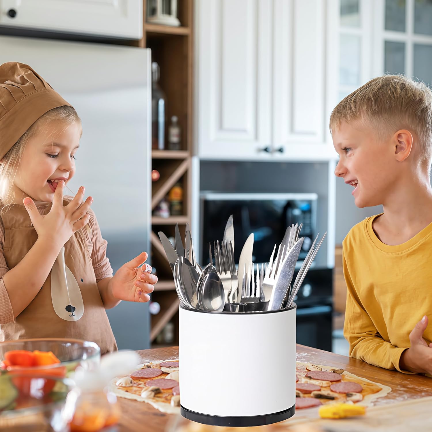 Silverware Organizer Kitchen Utensil Holder 360°Rotating For Counter Organizer Stainless Steel Storage Silverware Caddy 3 Compartment Flatware Spoon Spatula Tool Cutlery Container(White)
