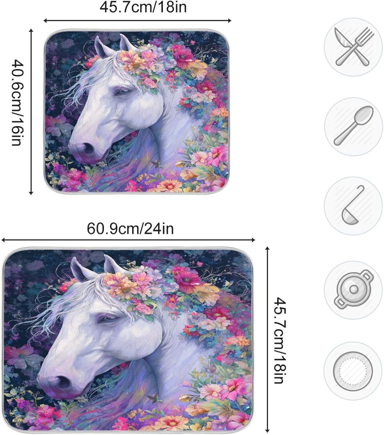 White Horse with Colorful Flowers Dish Drying Mat for Kitchen Counter Super Absorbent Dishes Pad Reversible Microfiber Protector Dish Draining Mats 16x18 inch