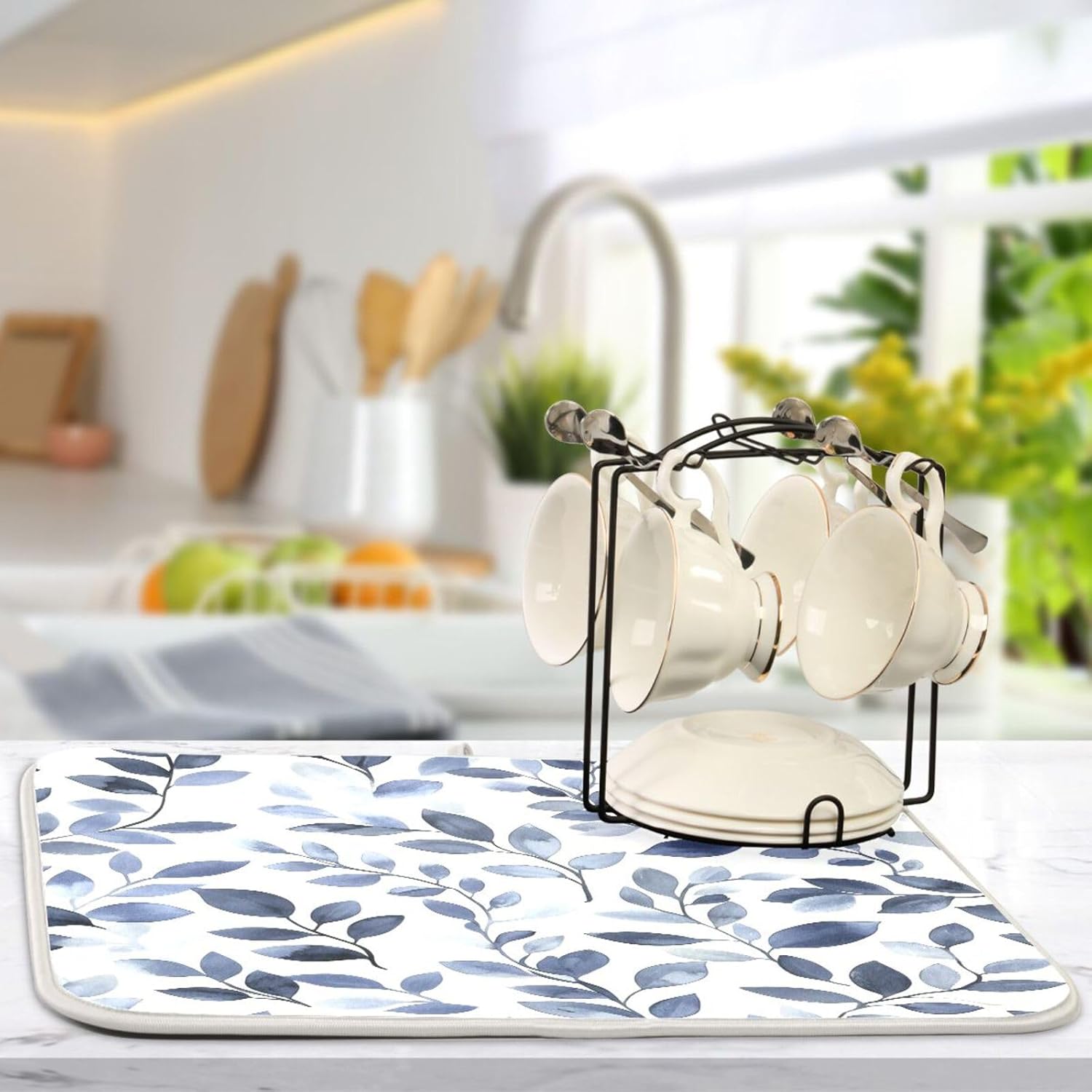 Light Gray Leaves Dish Drying Mat for Kitchen Counter Super Absorbent Dishes Pad Reversible Microfiber Protector Dish Draining Mats 18x24 inch