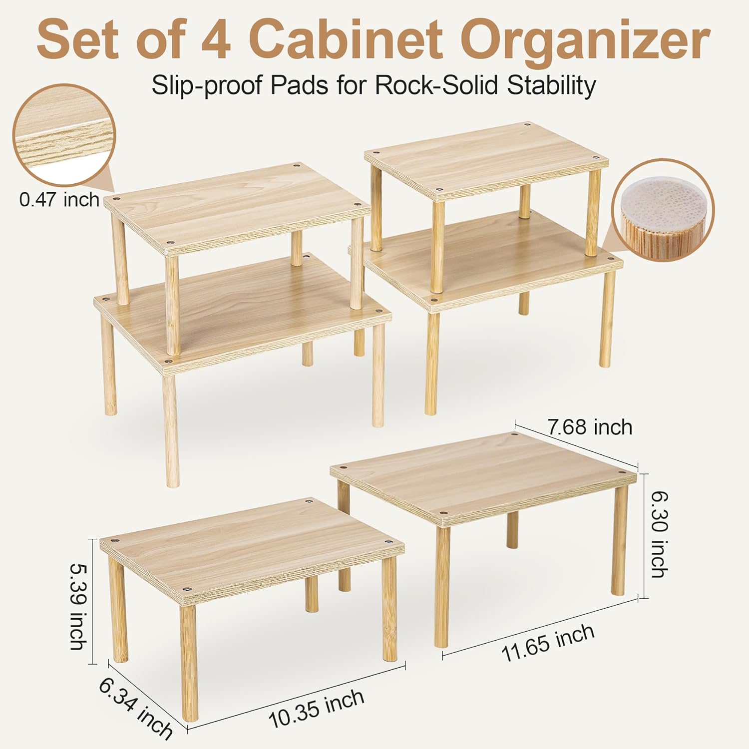 • 【Easy to Assemble Cabinet Organizer Shelf Set】Kitchen cabinet organizer includes 4 round wood legs and easy-to-follow instructions. Just screw in the legs—no complicated tools required. A perfect cabinet riser solution that’s quick to set up and built to last.