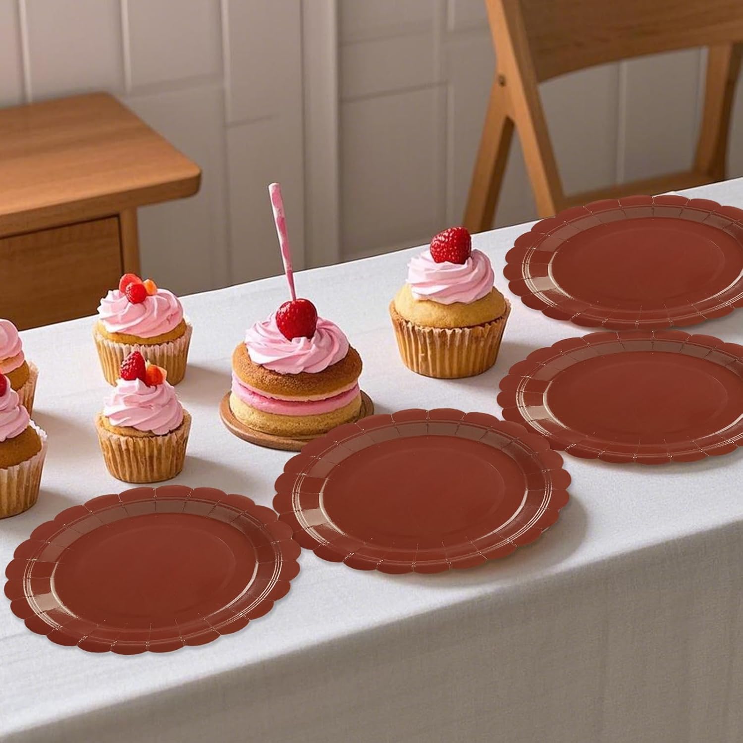 • 🧆50PCS Coffee Scalloped Plates: You will get 50 pieces 7 inch Coffee scalloped paper plates, which are made of high-quality paper materials that are not easy to break, you can place food, dessert or other items on the coffee color scalloped disposable plates. Can serve 50 guests and the beautiful coffee dinnerware set will leave a deep impression on your guests.