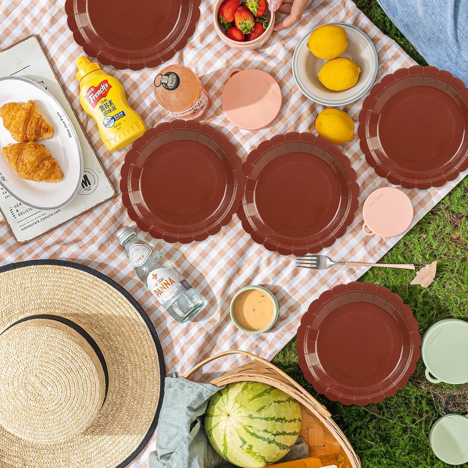 50Pcs Coffee Paper Plates-7 Inch Solid Color Scalloped Disposable Birthday Dinnerware Set Disposable Dinner Party Supplies for Christmas School Starts Wedding Baby Shower Fall Table Decor