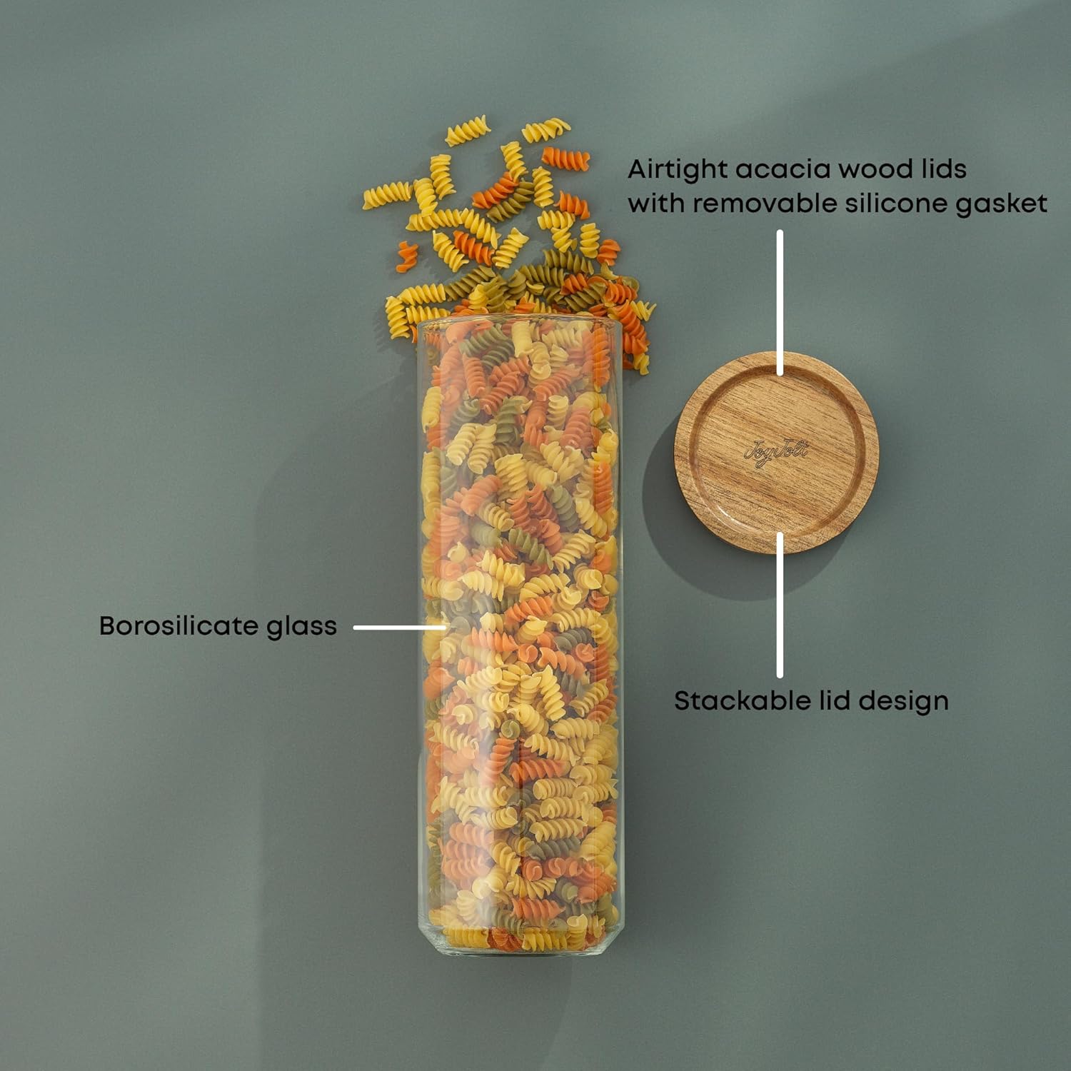 • AIRTIGHT CONTAINERS: Crafted with natural acacia wood lids, each glass canister features a BPA-free silicone gasket for an air tight, leakproof seal. Your ingredients stay fresh longer, while the unique acacia wood color on every lid ensures no two sets are alike.