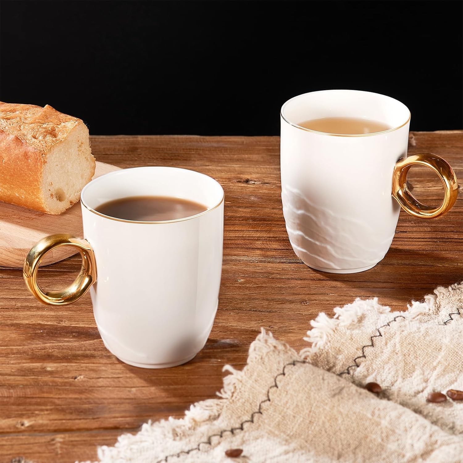 Chulan Upscale 12 oz Bone China Coffee Mug Set of 2, White Lightweight Fine Bone China Tea Cups with Gold Rim, Over 45% Bone Content Porcelain Ceramic Thin Mugs for Espresso Latte Mocha Freezer Safe