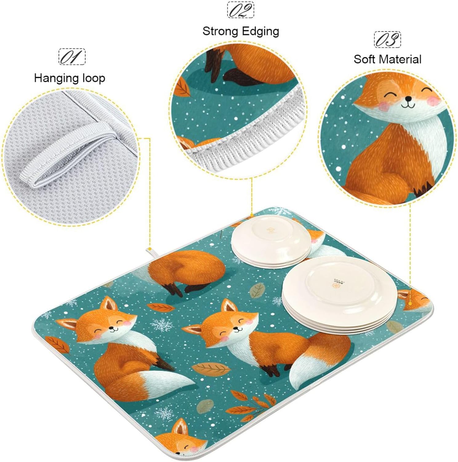 Cute Foxes Snow Pattern Dish Drying Mat for Kitchen Counter Super Absorbent Dishes Pad Reversible Microfiber Protector Dish Draining Mats 16x18 inch