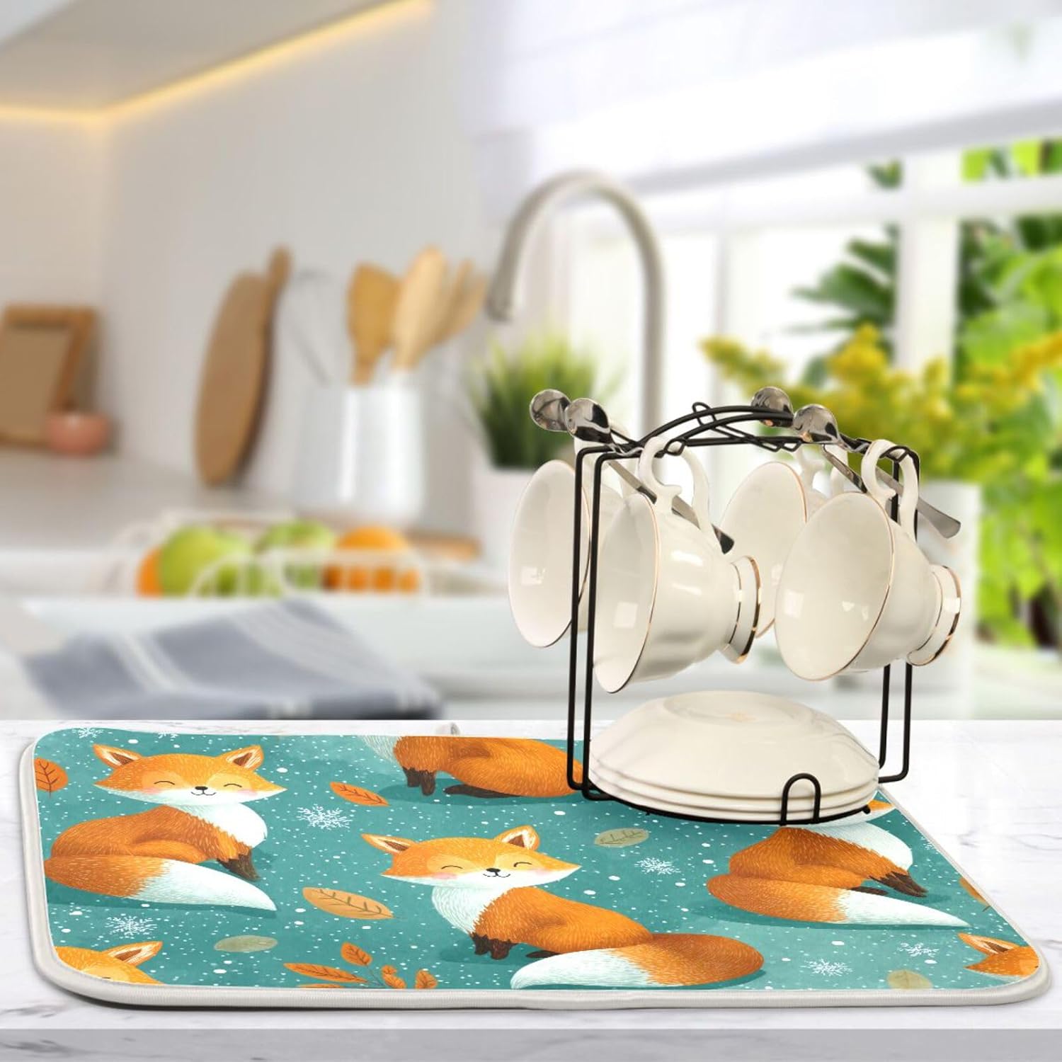 Cute Foxes Snow Pattern Dish Drying Mat for Kitchen Counter Super Absorbent Dishes Pad Reversible Microfiber Protector Dish Draining Mats 18x24 inch