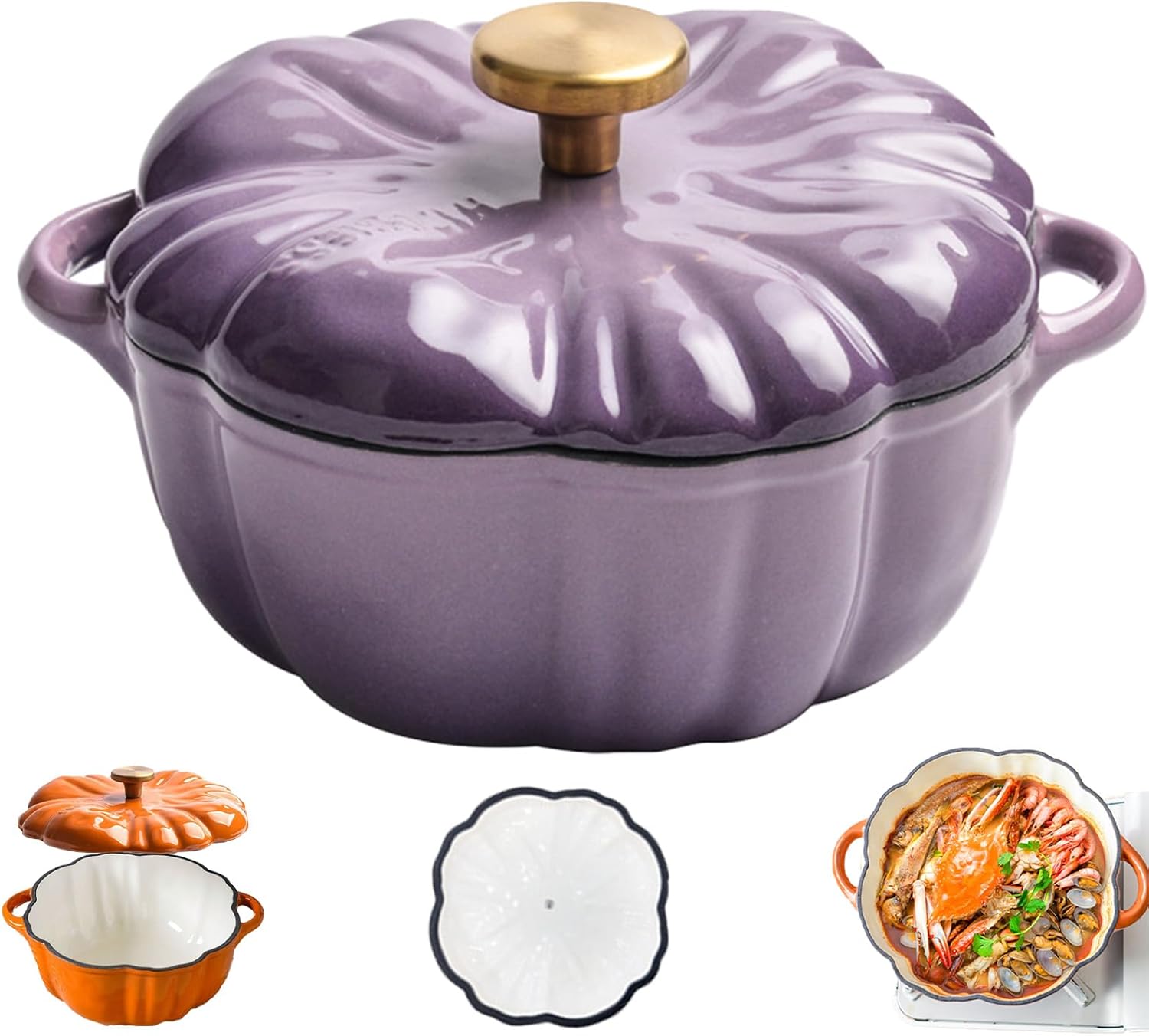 Enameled Cast Iron Pumpkin Dutch Ovens, Pumpkin Dutch Oven with Lid Covered Stockpot, 4-Quart Enameled Cast Iron Pot, Holds 2-3 Servings, Non-Stick, for All Stovetops (Purple Set A, S 6.2in)