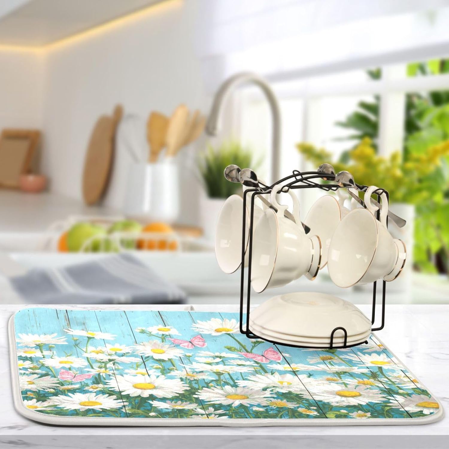 Daisies Flower Pink Butterflies Dish Drying Mat for Kitchen Counter Super Absorbent Dishes Pad Reversible Microfiber Protector Dish Draining Mats 16x18 inch