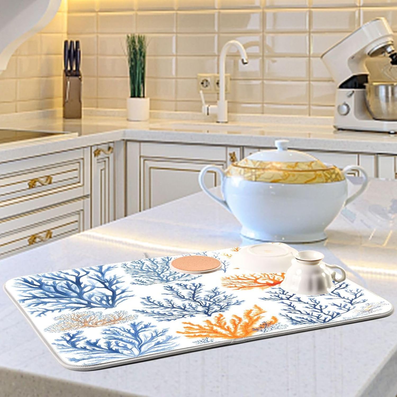 Coral and Seaweed Dish Drying Mat for Kitchen Counter Super Absorbent Dishes Pad Reversible Microfiber Protector Dish Draining Mats 16x18 inch