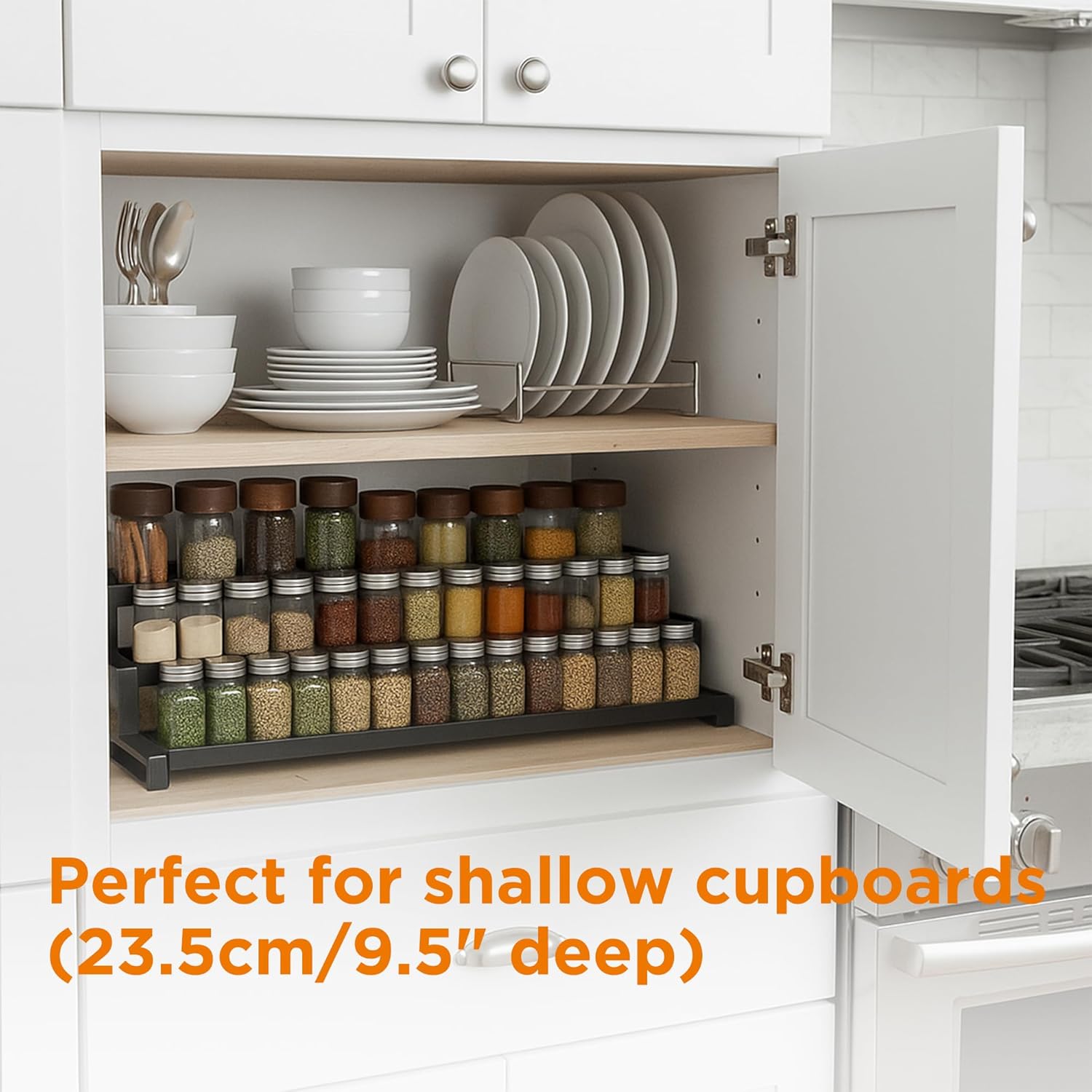 • 【3-Tiered & Expandable Large Spice Rack】This spice rack stand extends from 16"-29" to fit kitchen cupboards, countertops. Each tier is 2.55" (6.5 cm) deep—perfect for storing 6-8oz spice jars, seasoning bottles, or vegetable cans sauces and more.