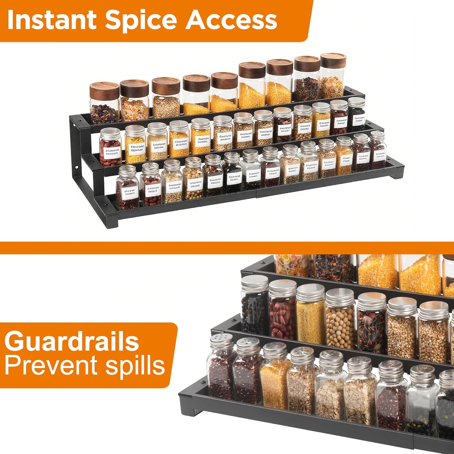 • 【Clear Labels & Slip-Resistant】Unlike flat spice shelf, 3-tier stepped design keeps jars elevated and labels visible at a glance—no more rummaging or losing track mid-recipe. Built-in guardrails design prevents slipping and keep counters neat and mess-free.
