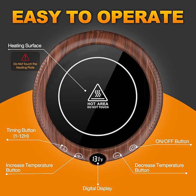 • 【Ergonomic & Smart Cup Warmer】The coffee warmer for desk features a tilted display design for easy viewing and ergonomic comfort during use. Its smooth, non-stick surface resists staining—whether from daily water marks or coffee stains—and can be effortlessly cleaned with a damp cloth to quickly remove residue.