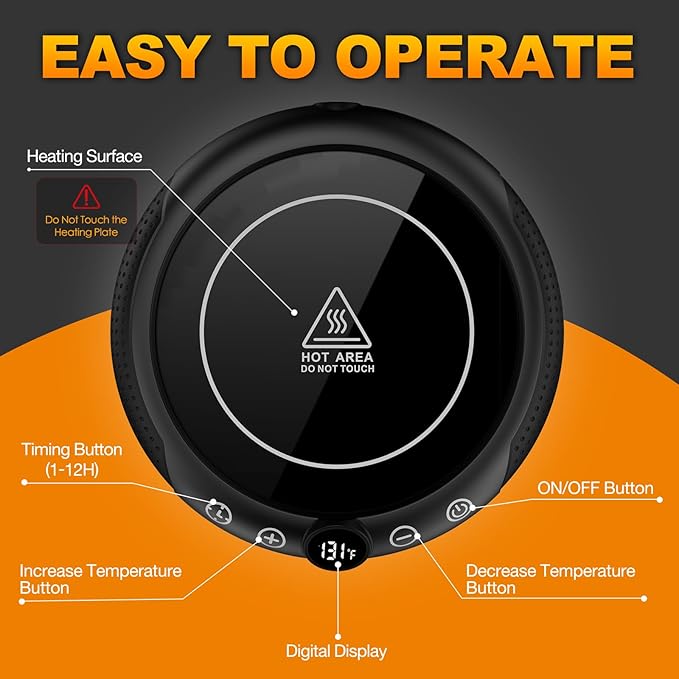 • 【All Day Perfect Drinks with Timer】1-12H Timed Auto Shut Off. No matter how busy you are, 12-hour timer of coffee cup warmer allows you to set it and forget it. Enjoy convenience and safety with our auto shutdown timer. The coffee cup warmer for desk automatically turns off after 4 hours by default, and you can customize the shutdown time from 1 to 12 hours.