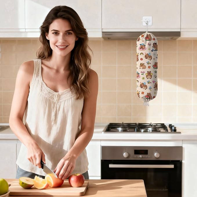 • ✅ User-Friendly Opening for Easy Use - This Capybara plastic bag holder is engineered for convenience. Its user-friendly opening allows you to extract grocery bags one at a time effortlessly - no more tangled mess! With a generous 9"x23" capacity, this bag organizer and dispenser fits perfectly on countertops, in cabinets, or on shelves. Keep your kitchen, pantry, or laundry room neatly organized with this smart plastic bag storage solution
