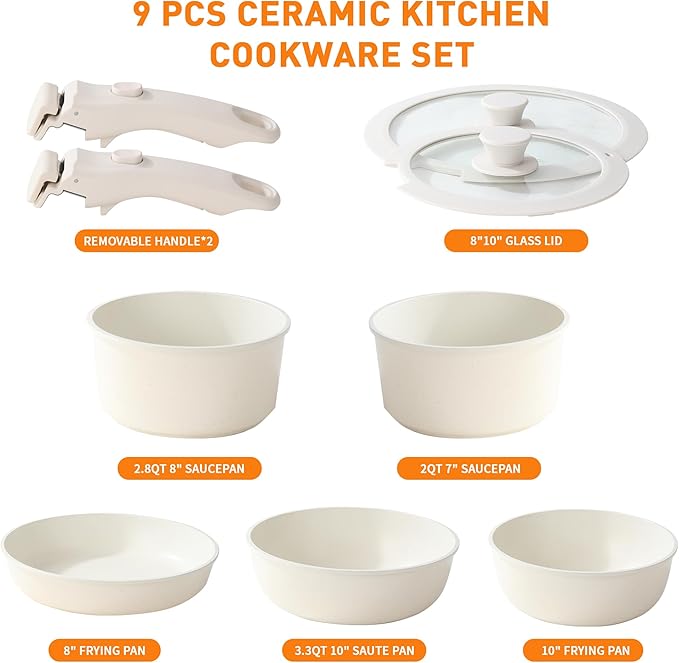 Ceramic Cookware Set 9 Pcs Pots and Pans Set with Detachable Handles Cooking Pan Saucepan Set Skillet Healthy Induction Cookware Oven Safe Dishwasher RV Kitchen Cream