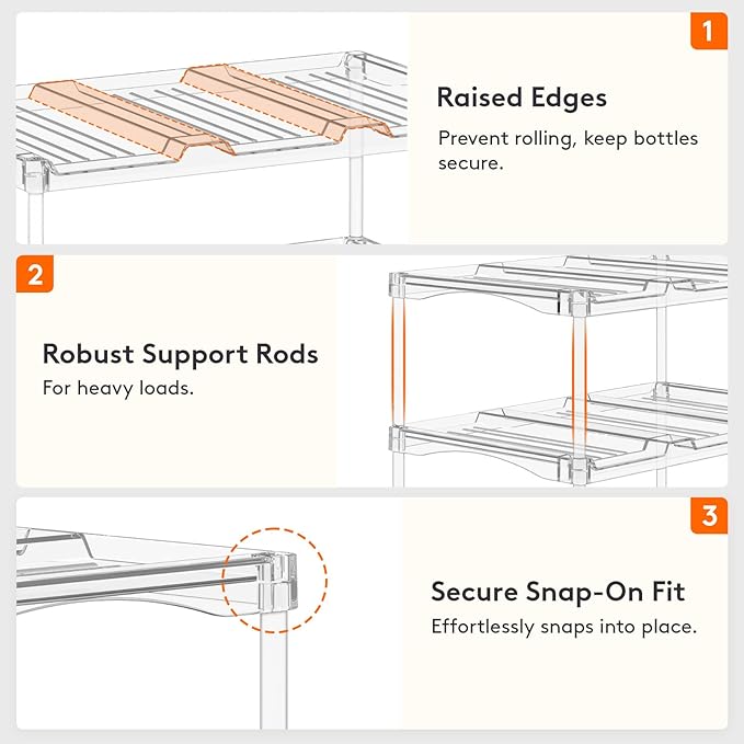 • Quick Stackable Setup: Assemble in seconds without tools; the sturdy interlocking shelves stack securely to maximize vertical storage while preventing bottles from rolling, and can be detached easily for cleaning or reorganizing your bar or cabinet