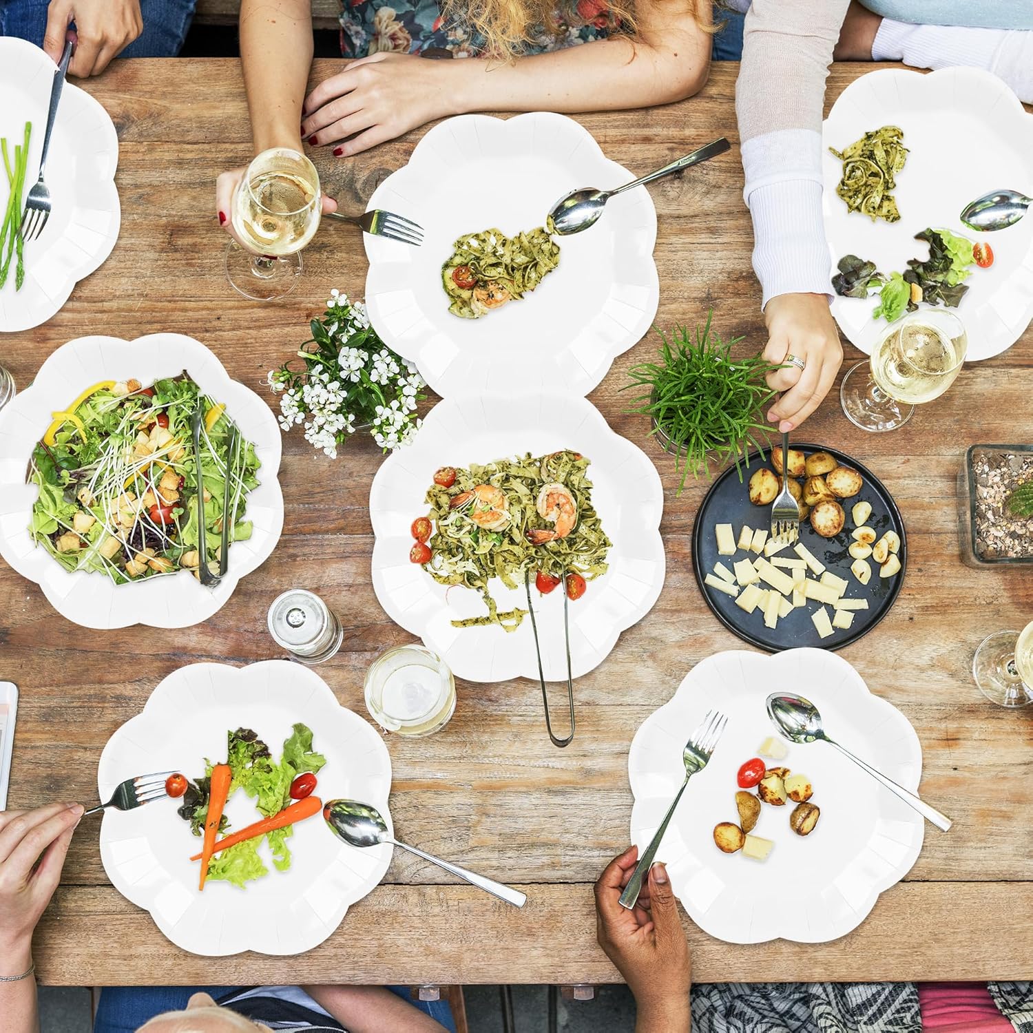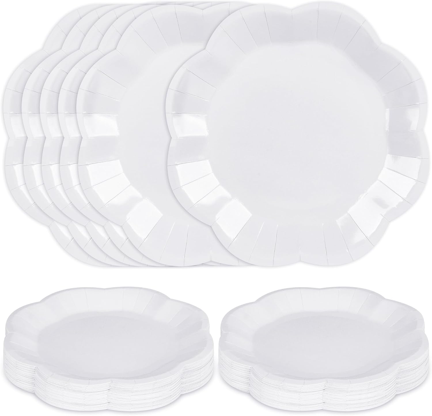 • Wide Application: This scalloped white paper plates effortlessly elevates any occasion. such as bridal shower, Weeding, baby shower, birthday party, tea party... it is also very suitable for family gathering and outdoor picnic. These white paltes would be the ideal decoration for your dinner party, making your guests feel valued and having a great time