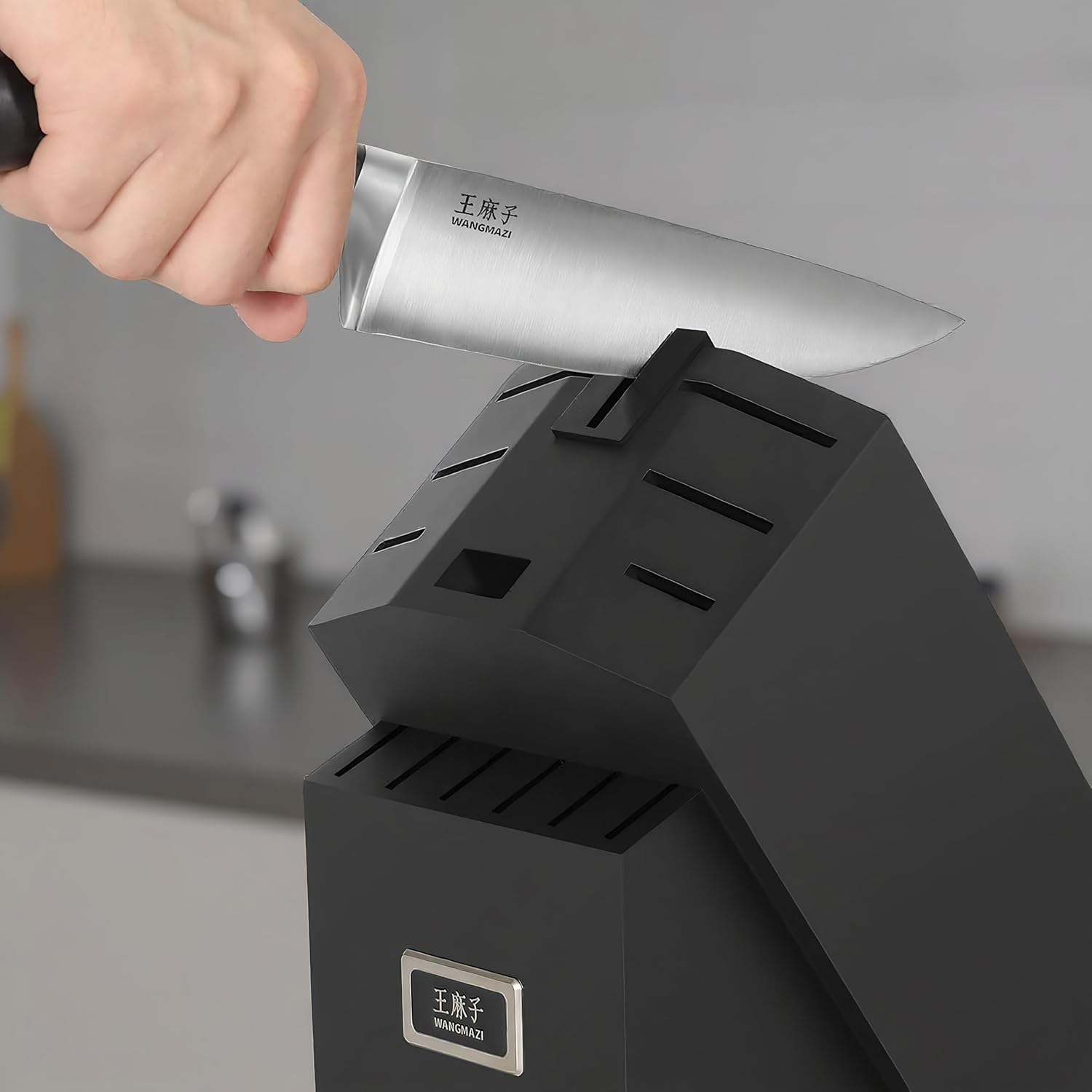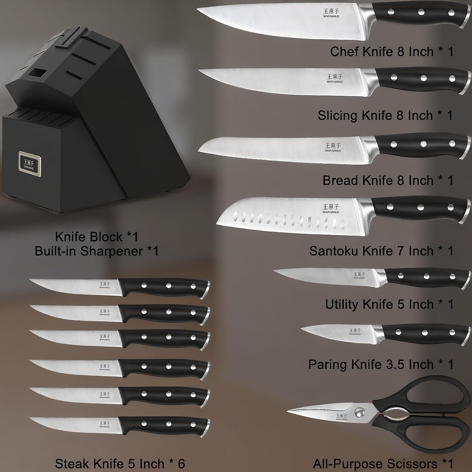 • High Value Knife Set:WANGMAZI knife set includes 8"chef knife,8"slicing knife,8"santoku knife,8"bread knife,5.5"paring knife,5"fruit knife,6*3.5"steak knives,kitchen scissors and a wooden knife holder.