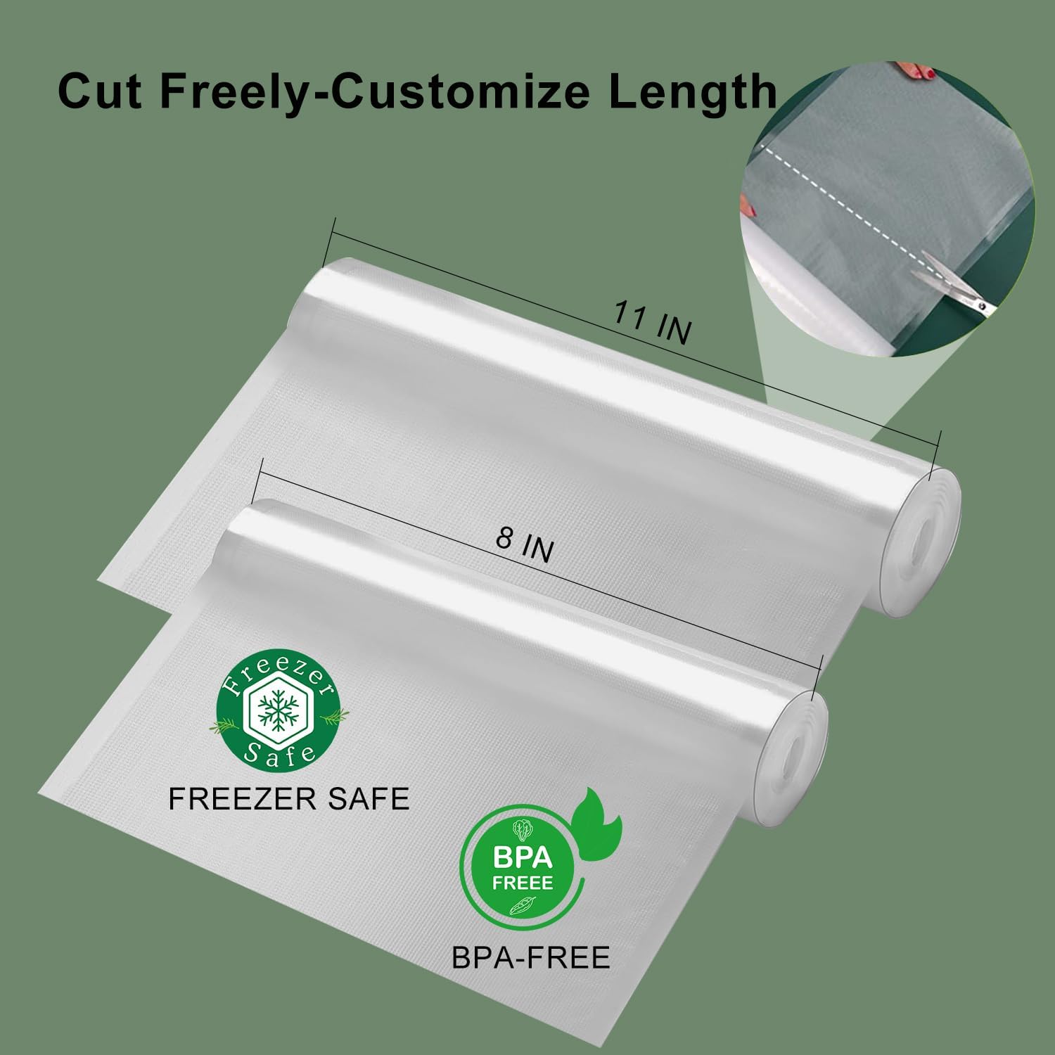 • 【Versatile 6-Roll Value Pack (Vacuum Sealer Rolls)】Includes 6 rolls—3 of 8″ × 16.4′ and 3 of 11″ × 16.4′—delivering the ultimate in food storage bags flexibility. Customize bag length with vacuum seal bags for portion control, meal prep, and efficient storage. Unlike pre-cut bags, our bag rolls reduce waste and cost, perfect for sous vide, freezer, and everyday food saver use.