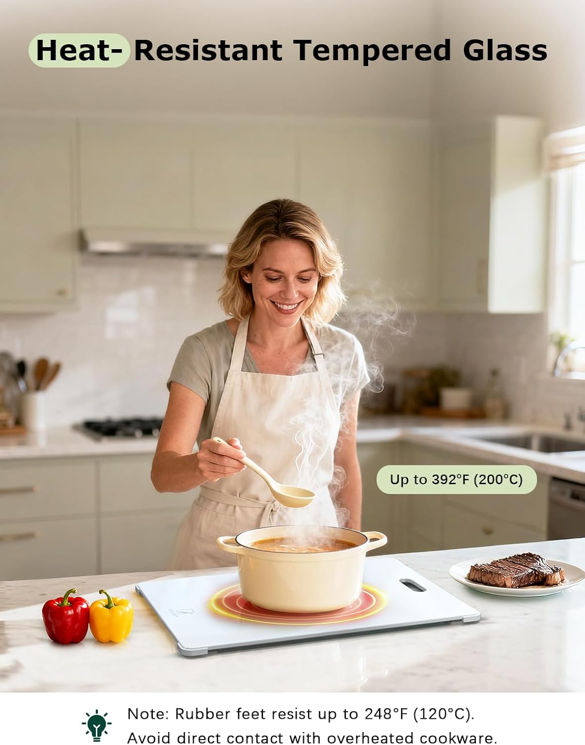 • 【Heat Resistant up to 392°F】Withstands heat up to 200°C / 392°F, making this cutting board glass surface perfect for hot pans, baking dishes, or soup pots. Use it as a trivet or serving board to move cookware from oven to table without damaging counters—a versatile, heat resistant kitchen essential.