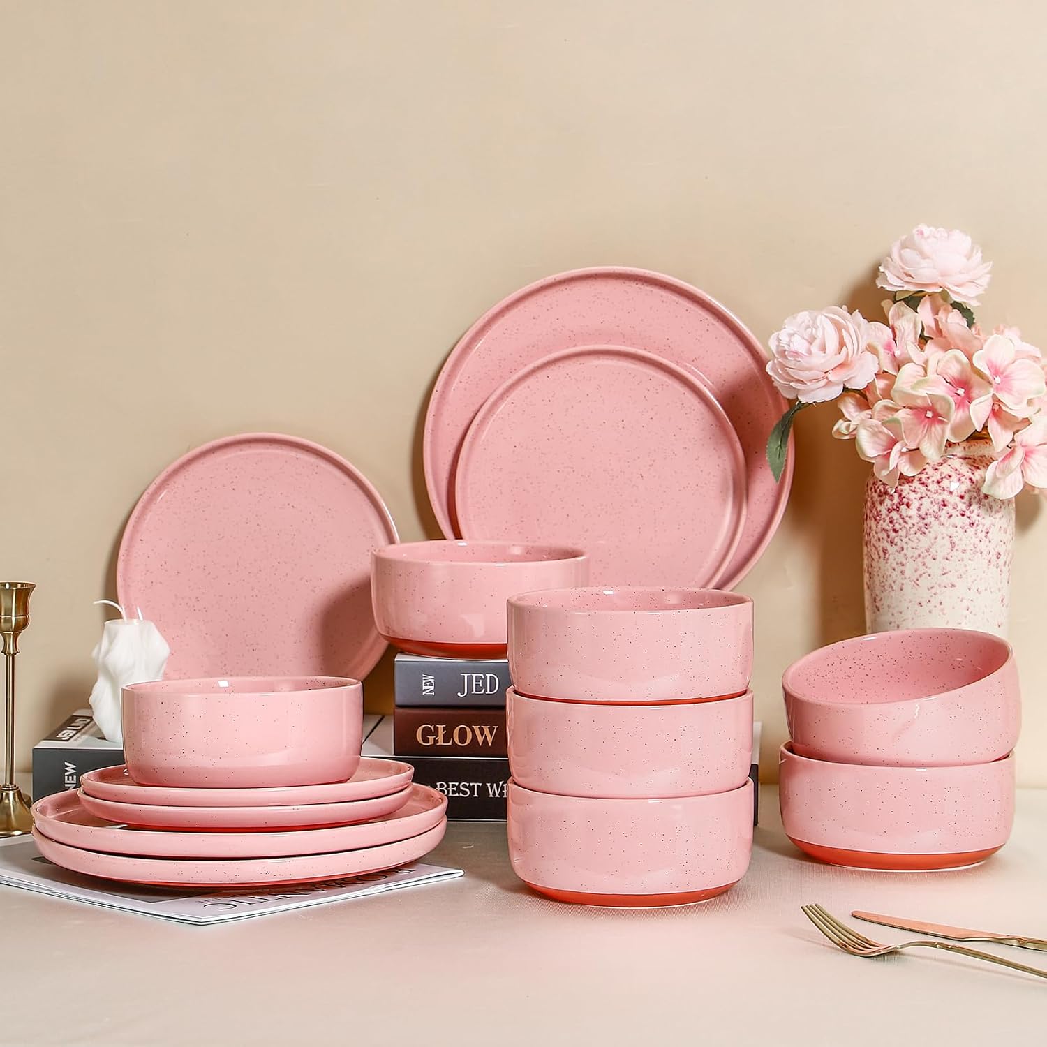 GZG Modern Art Series - 6 Pcs Speckled Stoneware Plates and Bowls Sets, Ceramic Dinnerware Set with Rustic Terracotta Underside, Microwave and Dishwasher Safe Handcrafted Dishes Set - Blush Pink