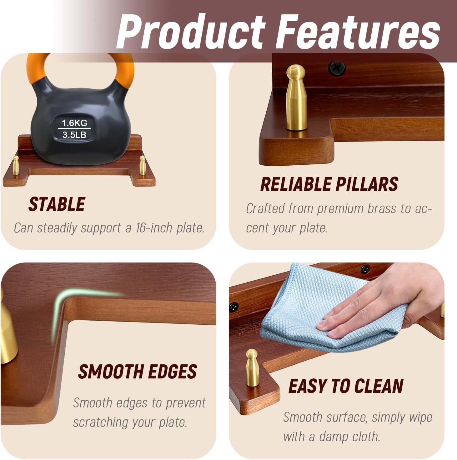 • Package Includes:1 Acacia wood wall plate holder, 2 high-quality brass pillars, 2 matching gold screws, 2 wall-mounting screws, and 2 matching expansion plugs.Our wooden wall plate holder is suitable for displaying items measuring 6 to 16 inches in height and up to 3 inches in depth, with a maximum weight capacity of 3.5 lbs.