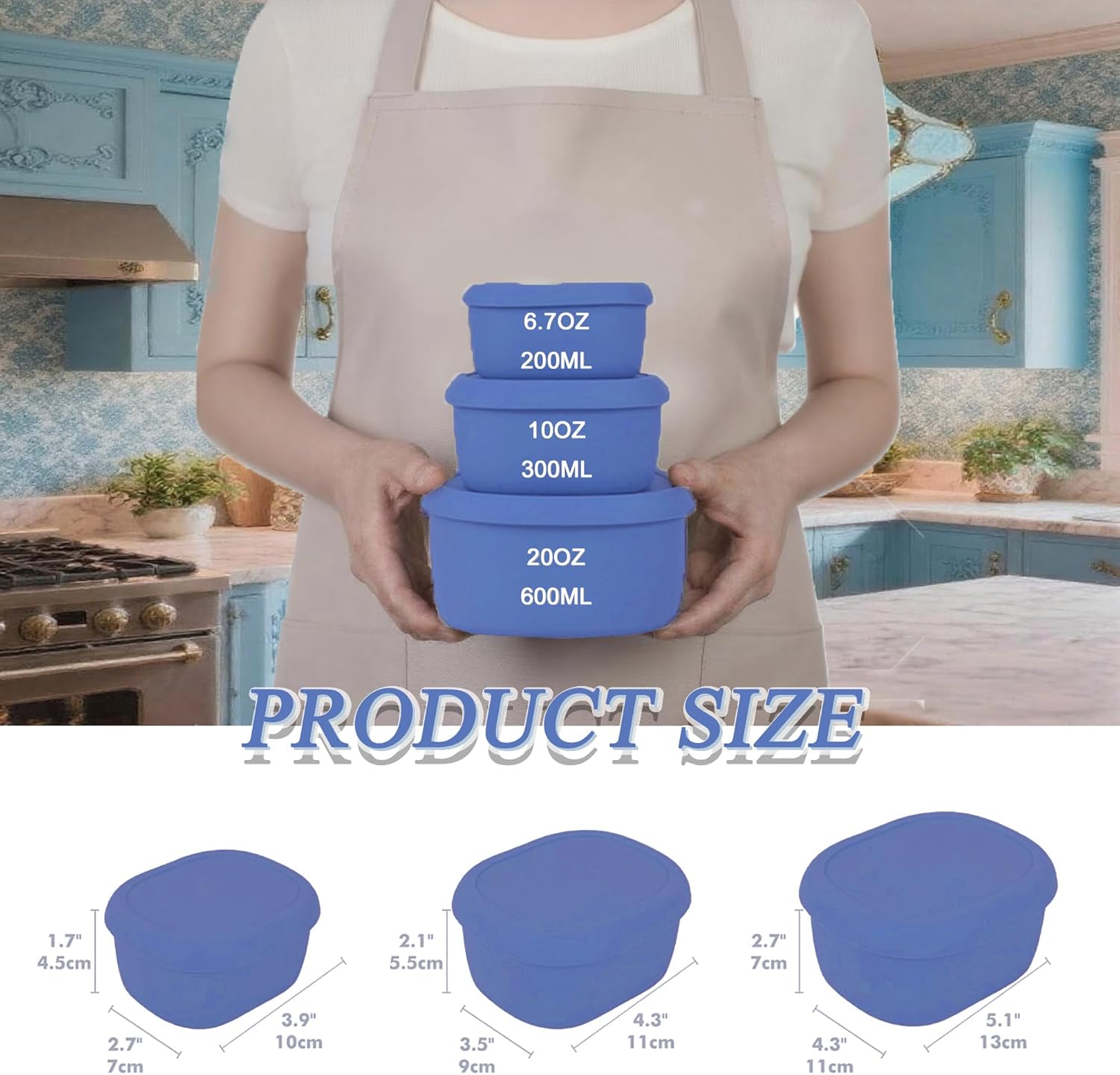 • [Space-Saving Nesting Design]: This nesting silicone container set includes 3 different sizes to meet your variety storage needs. The set include: 1pcs 3.9" x 2.7" x 1.7" (6.7oz/200ml); 1pcs 4.3" x 3.5" x 2.1" (10oz/300ml); 1pcs 5.1" x 4.3" x 2.7" (20oz/600ml) silicone container with matching easy-to-clean silicone lids. With a stackable, space-saving design—perfect for compact storage in cabinets or on-the-go.