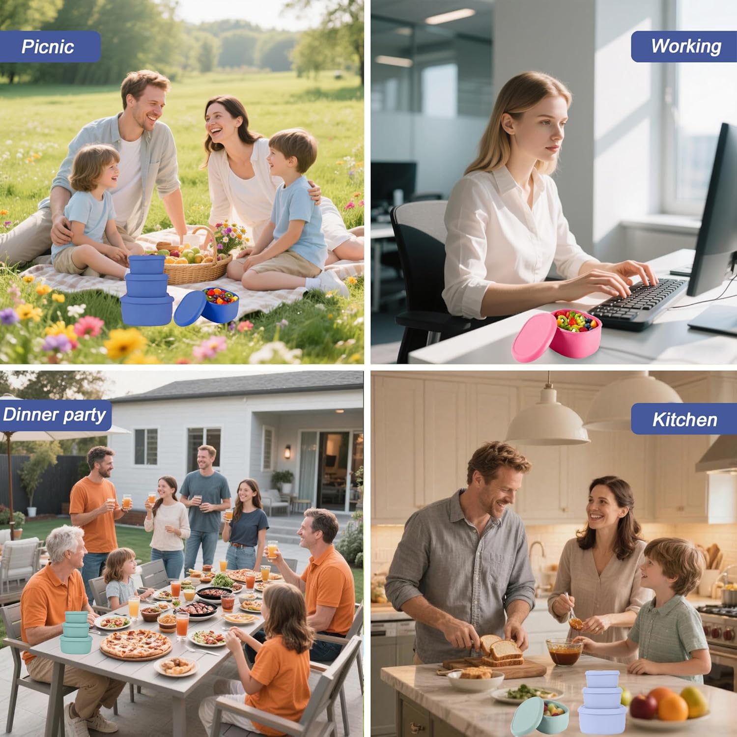 • [WIDE APPLICATIONS]: These stackable silicone lunch containers are perfect for storing sandwiches, salads, fruits, nuts, snacks, dressings, and more. Ideal for home, office, picnics, camping, and meal prep—suitable for both fresh and frozen foods. Plus, sturdy, reusable!