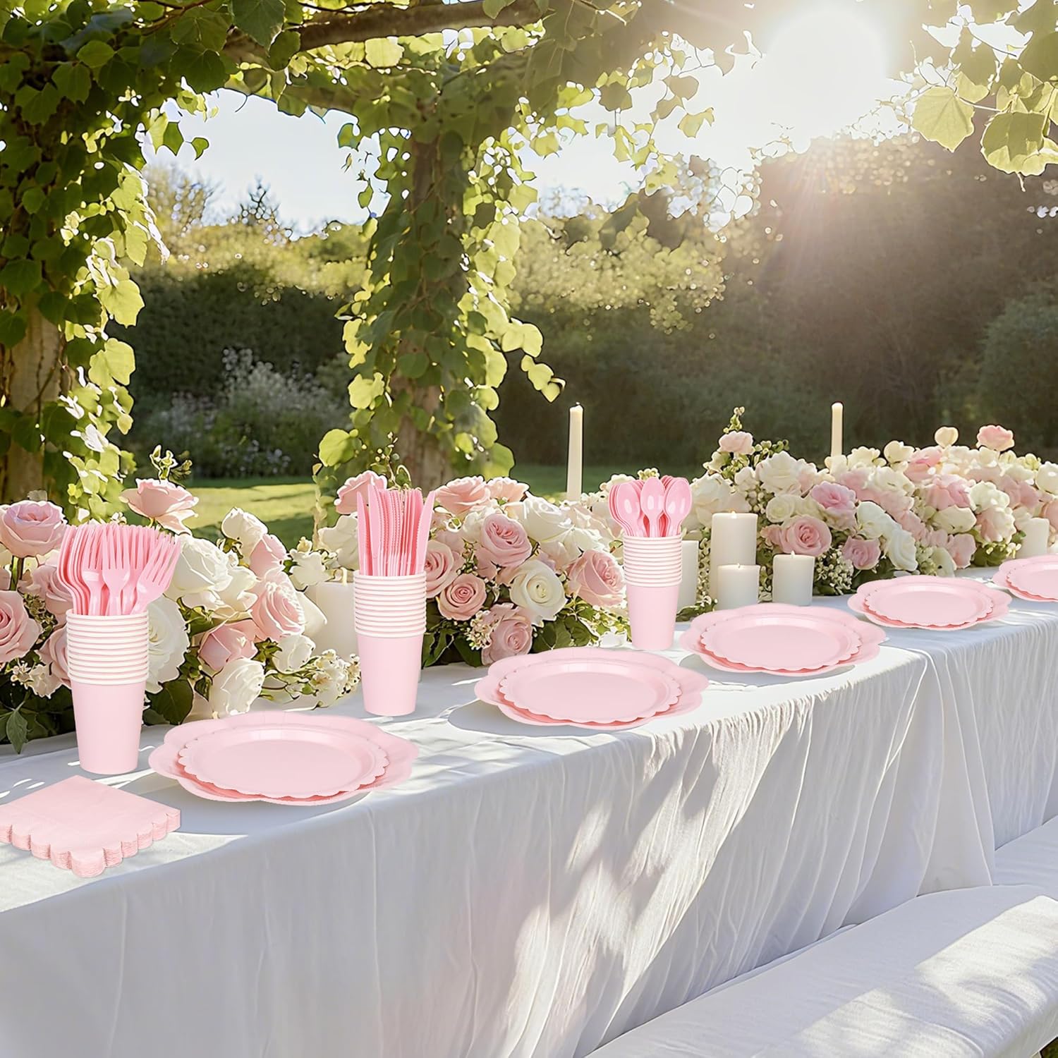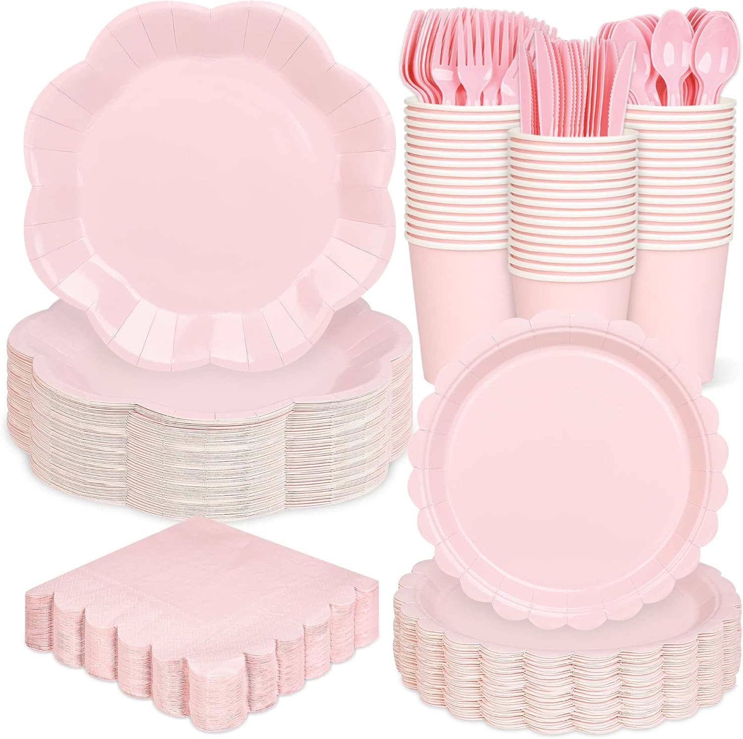 • 【Safe and Reliable Material】Our pink tableware set are made of quality thickened paper, safe and reliable. You can use these light pink scalloped plates to hold cold and hot food without fading or odor. Pink luncheon paper napkin has 2 layers to ensure that it does not tear easily when used. The knives, forks and spoons are made of plastic, not easy to break. You can use them with confidence in important days