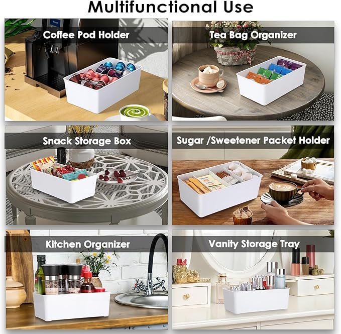• SUITABLE FOR YOUR EVERYDAY USE - This divided storage container is perfect for creating a clean and organized kitchen cabinet or pantry. Ideal for organizing seasoning packet, tea bags, instant coffee packets, sweeteners, hot cocoa mix, snack and more. Four deep compartments allow you to separate and organize items stored upright, and are also great for keeping cat and dog food organized.