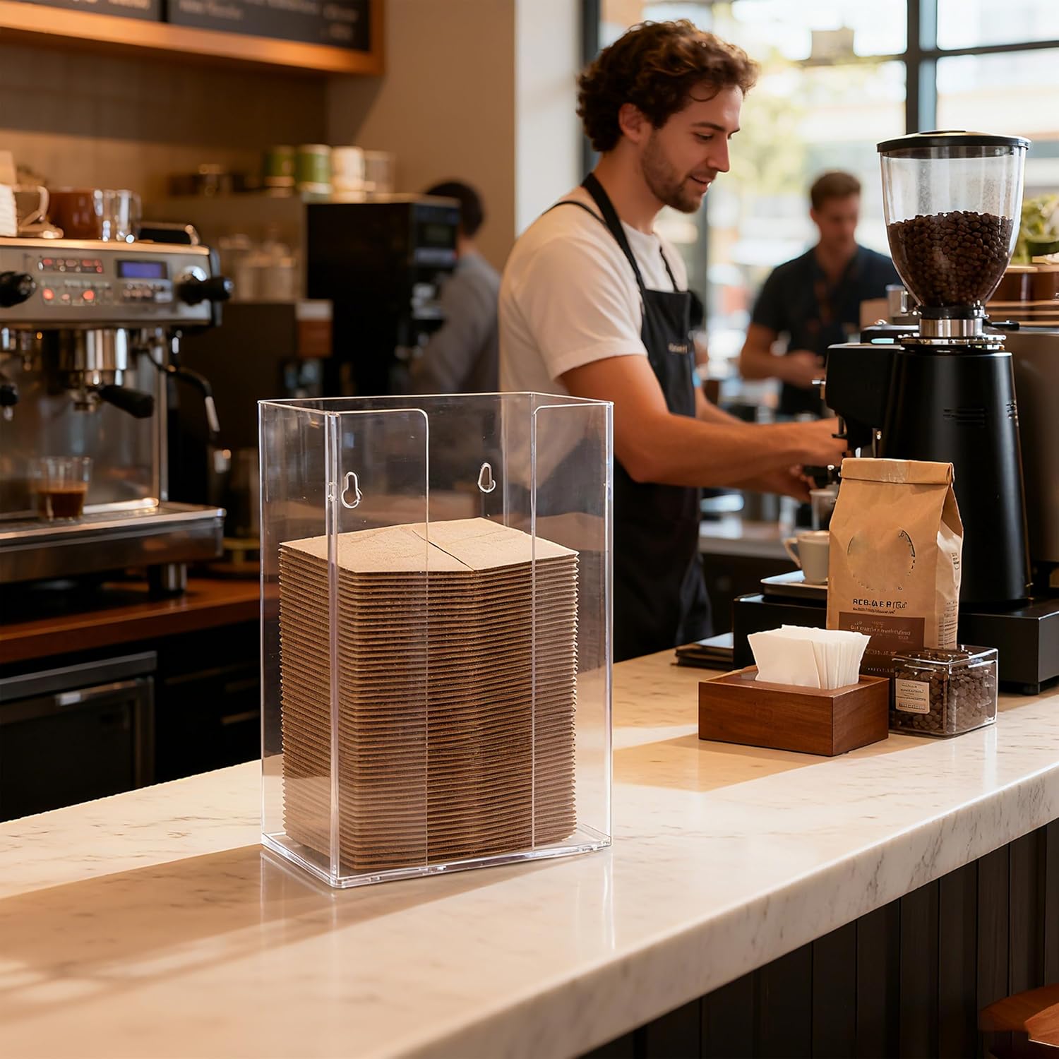 • Universal Fit for Most Kraft Paper Cup Sleeves:The width of paper cup sleeves organizer is 5.25in, this organizer perfectly fits standard disposable kraft paper coffee cup sleeves—compatible with 8oz, 12oz, 16oz, and 20oz coffee cups. Whether you use sleeves for hot lattes, cappuccinos, or teas, it keeps them organized without squeezing or damaging the paper material