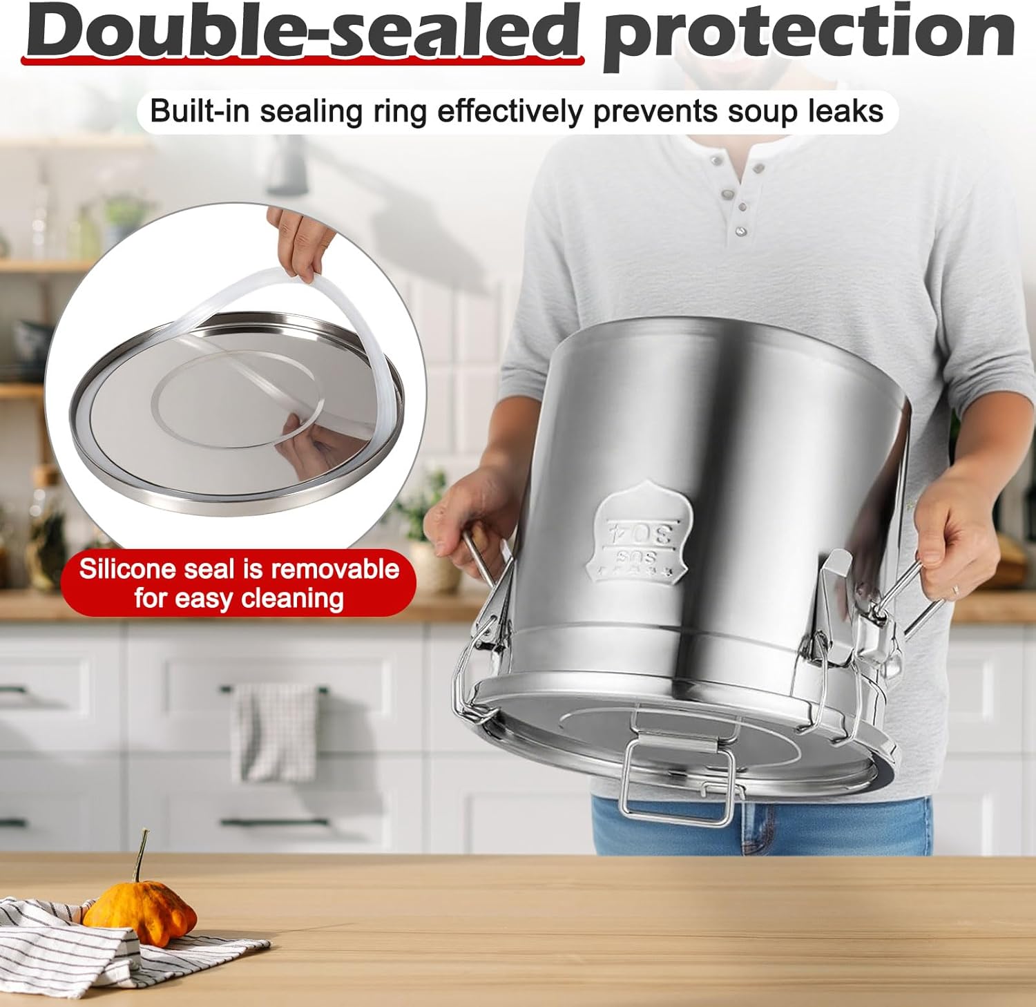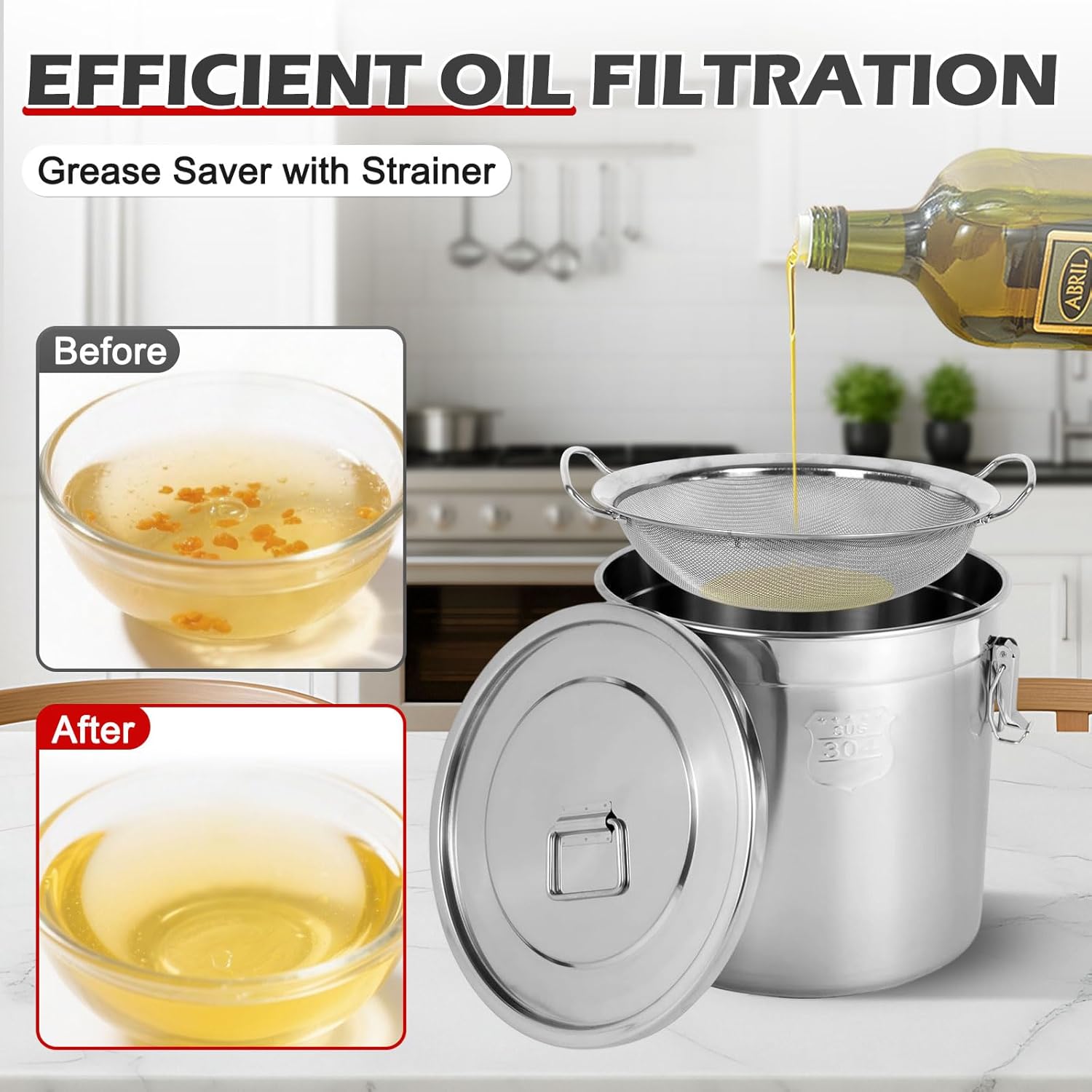 • 【Sturdy & Well-sealed】- Adopts 2-layer food-grade stainless steel, this airtight stainless steel container is safe and odor-free, has a strong structure and is corrosion-resistant. It's equipped with a 10-inch diameter double-ear filter to help you easily filter oil residue. The double sealing cover with silicone gasket and locking buckle will create a vacuum sealing environment to block air, moisture and odor, which can effectively prevent internal oil and soup leakage and oxidation of ingredients