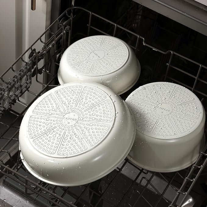 • 【Effortless Cleaning for Clutter-Free Cabinets】 Thanks to its non-stick properties, cleaning is a breeze. Serving as both cookware and tableware, Carote cookware set saves up to 70% space when handles are removed for optimal storage and easy stacking