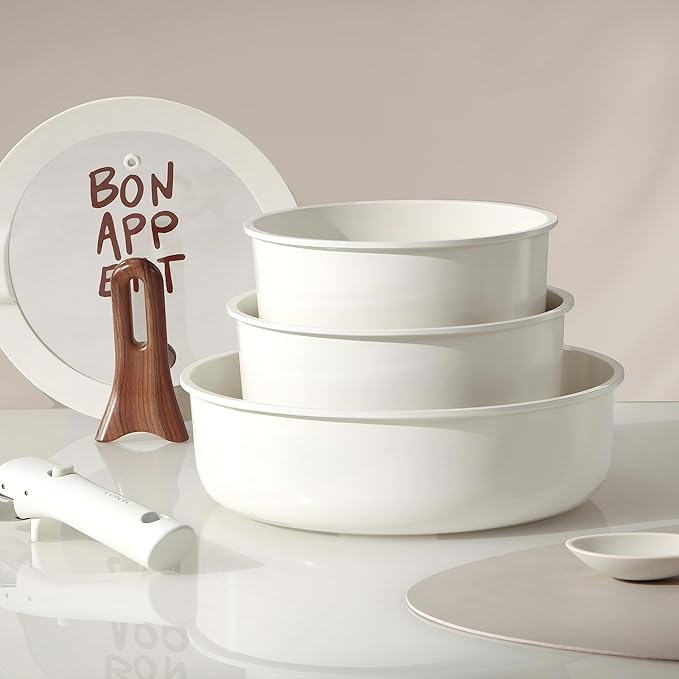 CAROTE 18Pcs Pots and Pans Set Non Stick, Nonstick Ceramic Cookware Set with Detachable Handle, Non Toxic Kitchen Cooking Sets, PFOA Free, Oven Safe, Stackable Induction Ready, Cream White