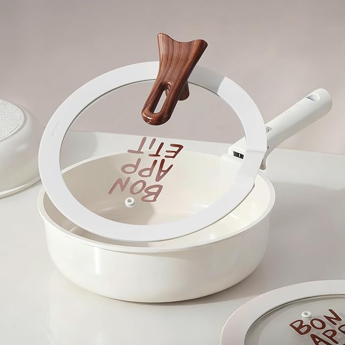 • 【Set Includes】8'' frying pan, 10'' frying pan, 10'' sauté pan, 2-qt saucepan, 3-qt saucepan, 8''/10'' stand-on lid, 2*detachable handle, 1*silicone spatula, 1*soup spoon, 4*pot protector and 3*silicone pad