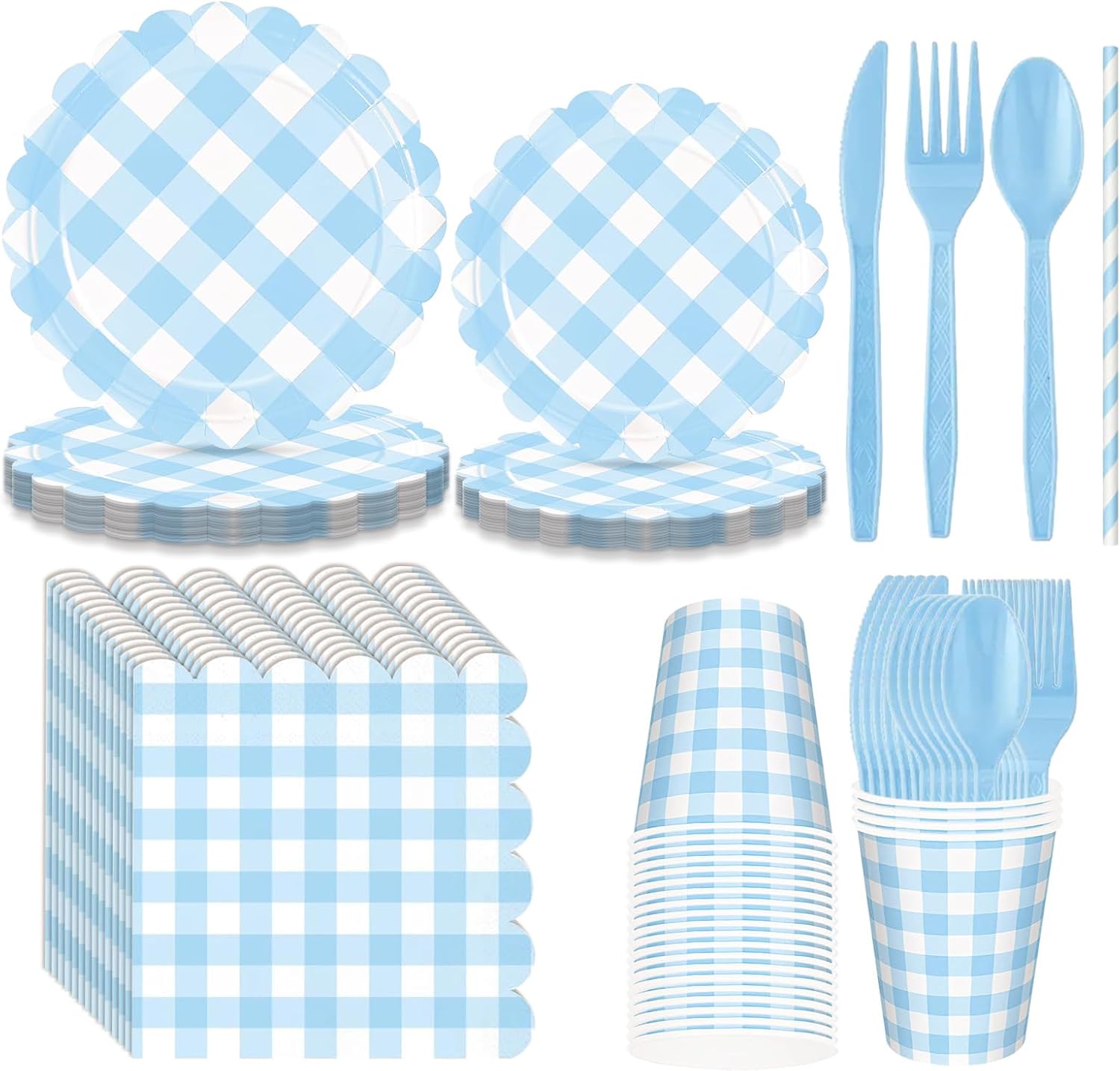 192 PCS Gingham Party Supplies Serve 24 Guests Gingham Plates and Napkins and Cups for Birthday Decorations Baby Shower Checkered Party Supplies Dinnerware Sets for Girl Boy Light Blue