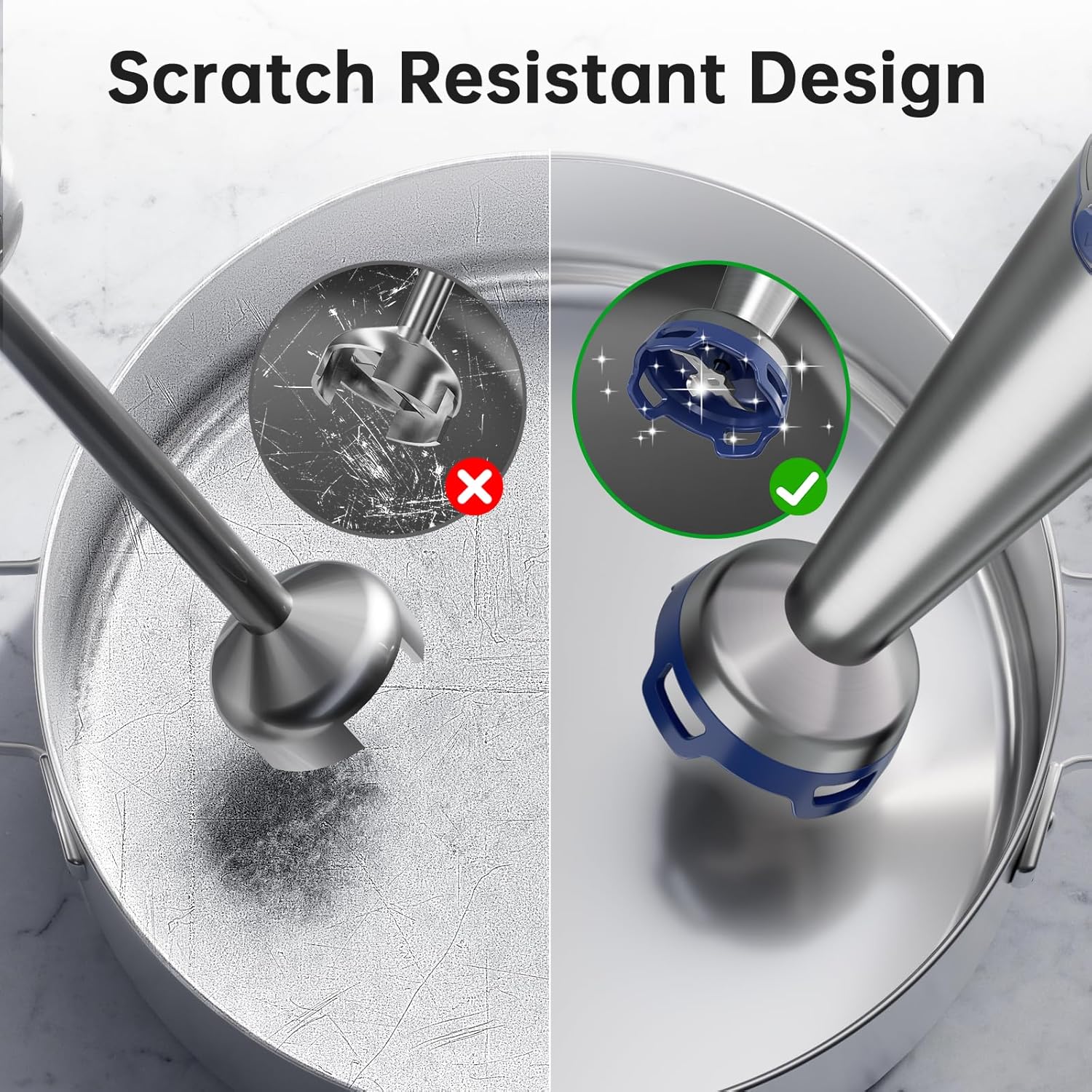 • Effortless Clean-Up, Scratch-Free: Features a unique food-grade nylon blade guard designed to minimize suction, preventing scratches on your pots and pans and keeping splashes at bay for a cleaner kitchen and hassle-free clean-up