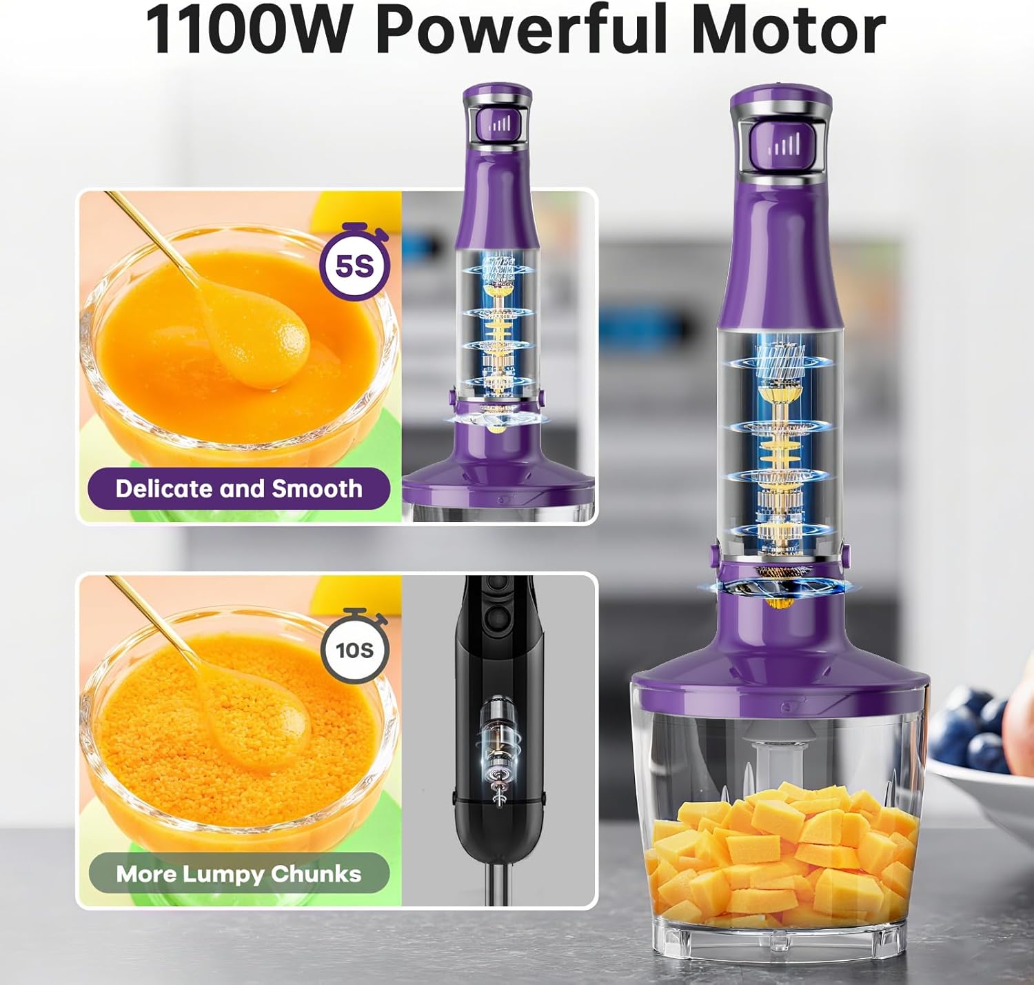 Immersion Blender Handheld Corded Hand Blenders Set 1100W, Trigger Variable Speed 5 in 1 Stick Emulsifier with Chopper, Whisk and Frother for Soup, Baby Food and Smoothies, Purple